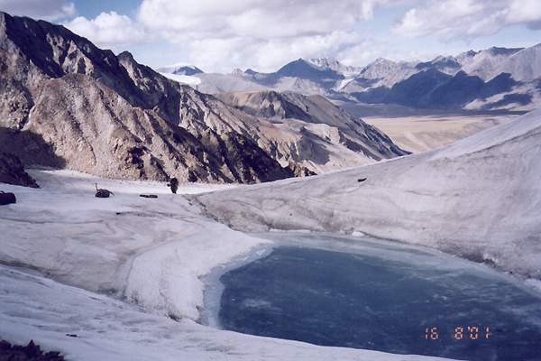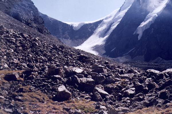 На следующий день опять сюрприз: туман, видимость до 40 метров. Хорошо, что накануне мы предприняли небольшую разведку и теперь представляем путь спуска. А он непростой - на пути ледопад. Лавируя между трещинами, подошли к левому борту ледника, вышли на осыпной склон и вдоль скал спускаемся вниз. Периодически со склонов сходят камни, а внизу поджидает мощный рантклюфт (трещина между скалами и ледником), куда совсем не хочется падать. Пройденный перевал по праву первопрохождения называем "Татаро-Монгольский".