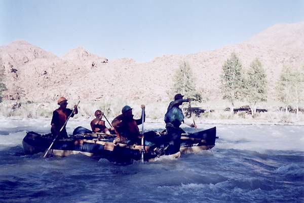 Но перед выходом к начала сплава нам предстояло еще одно испытание - 30 км по каменистой горной пустыне. Одуряющая жара и полное отсутствие воды. Только к вечеру наконец-то добрались к реке! Побросав вещи, залезли в воду, пили, барахтались как дети. И вот наконец сплав! Катамаран готов к отплытию, рюкзаки привязаны. В путь!