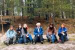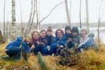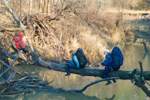 12.55 – 13.25 - переправа. Аскар и Илья (два представителя сильного пола (что нам не показалось), остальные 10 девушек (гораздо сильнее)) выяснили, что ногами пройти невозможно, надо переползать. Алина доказала обратное: в скользких резиновых сапогах быстро перебежала на ту сторону. Но ее пример не оказал должного действия на всех и кроме нескольких смельчаков (Зайтуна, Рушана и Эля) остальные переползали по бревну (скользкому, сырому, холодному). Самым сложным и забавным (со стороны) моментом были два сучка – маленьких, но очень гадких!!! В этих местах надо было приподняться на руках и перенестись на другую сторону от сучка. Именно в этом месте все девчонки замирали и подолгу сидели не решая перескочить сучок, но с криками и вздохами это все же случалось.