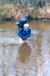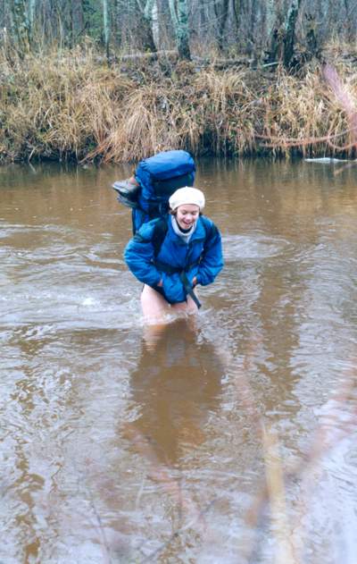 Во время следующей ходки погода ухудшается: идет мокрый снег. Еще два привала и по карте должен быть брод, но нет реки. Вот незадача. На нашем пути встала старица, и пока мы ее обходили потеряли и дорогу, и просеку, и тем более брод, но нашли реку. Моментально были посланы разведчики для поиска брода (имеется в виду дороги переезжающей реку), который найден не был. Решили переходить где попало, т.е. здесь. Нашли более менее подходящий берег, наломали каждому по палке (метра два) и Зайтуна, как командир вошла в реку первая, для зондирования дна и глубины. С первого раза не получилось, пришлось вернуться и вторая попытка была удачной: реку можно перейти ниже пояса. Когда мы увидели довольную и заледеневшую Зайтуну на том берегу, то сразу все начали раздеваться, т.к. мужчин с нами не было, то мы переходили так чтобы не мочить ничего из одежды. Вода ледяная и когда заходишь в воду, то открывается рот от шока и хочется единственного: на тот берег и одеться, поэтому бежишь ничего не соображая и не слыша. Таким образом все перебежали перенеся с собой по грязной и тяжелой палке так не разу не воткнув ее в дно и выкинув ее только около берега, после нас там валялась куча палок. Дина думает, что палки использовались в похожей роли, что и ножи в зубах рожающей женщины или кляп во рту пленного – чтобы не кричать. Хотя некоторые и кричали, говоря, что выходит все возмущение и становится теплее. Все перешли и поняли ужасное: у Зайтуны остался рюкзак на том берегу. Пришлось ей опять лезть в воду. Теперь она рекордист по брожению реки Юшут - 6 раз. Чтобы поднять дух команды на берегу девчонок ждало вино, которое согрело душу и тело. Настроение поднялось и из-за пройденного этапа.