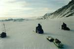 Во время движения по фиорду Марата и при подходе к мысу Челюскина издалека наблюдали за нерпами. Их черные силуэты очень четко просматривались на белом фоне. Это очень осторожные животные, при подходе метров на 500 они мгновенно исчезают в своих лунках.