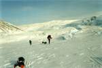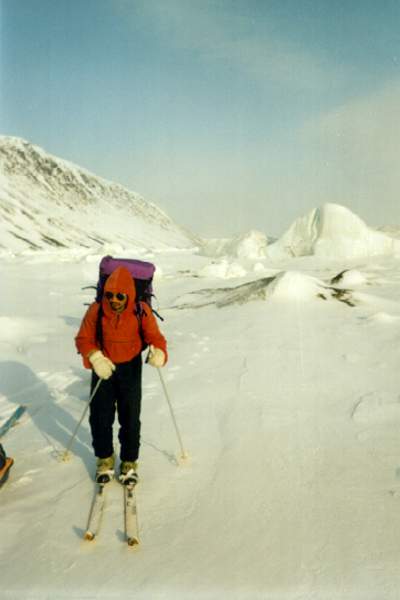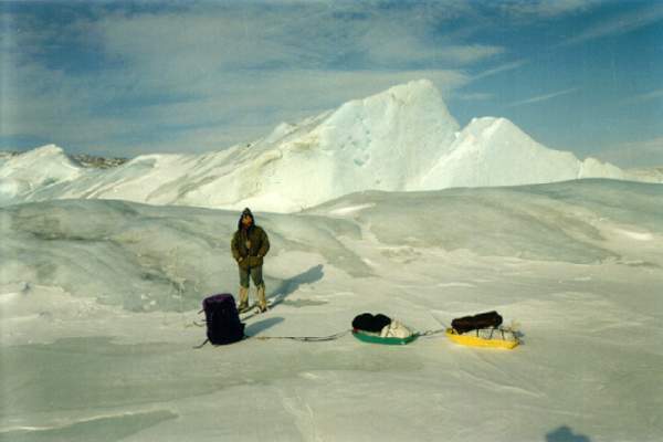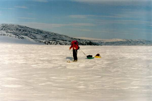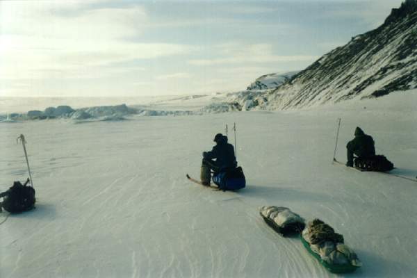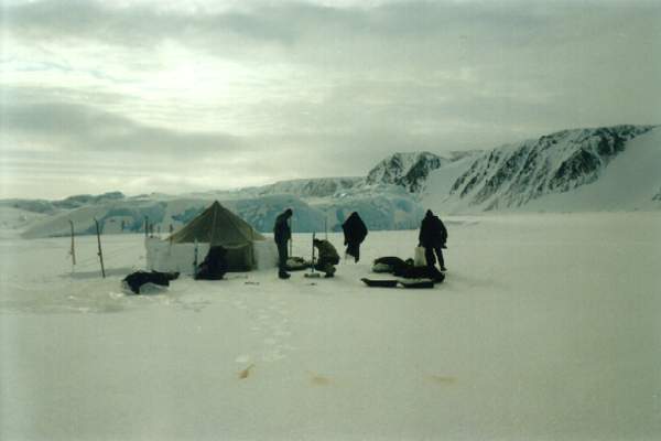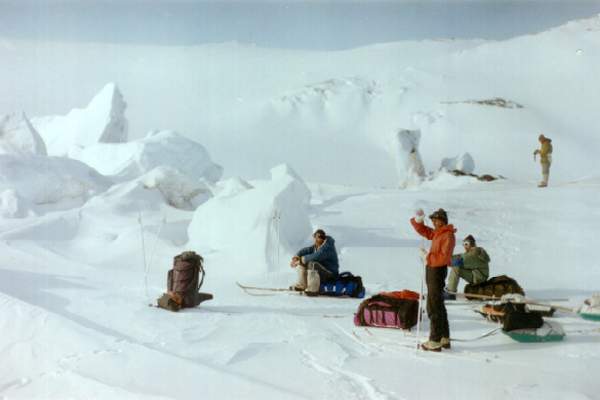 Вот все вещи собраны, уложены на нарты. Теперь в путь. Переход за переходом, преодолевая торосы или другие препятствия, идешь вперед. Во время коротких привалов едва успевают отдохнуть плечи. Редко удается сидеть более 10 минут. Холод постепенно проникает внутрь, мокрая спина начинает дубеть. Самое страшное теперь - навьючить на спину рюкзак. Тяжелый рюкзак прижимает к спине уже успевшую остыть одежду. В этот момент по всему телу пробегает холод. Полперехода уходит, чтобы согреться.