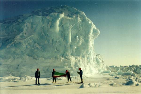 Трудно отпускает Арктика. За два дня до конца маршрута впереди в туманной дымке удалось разглядеть силуэты башен в районе погранзаставы. Нашей радости не было предела. Сразу же начались разговоры о пути домой, а бортах, о работе, о домашних делах. Но напоследок Арктика «посылает» нам еще одно испытание. Мы уже представляли себя в теплом общежитии метеорологов, мечтали об отдыхе. Впереди уже как на ладони поселок «Передающей антенны». Но после относительно легкого пути по участку битых льдов замечаем, что подход к суше преграждают мощнейшие поля торошения. Вот она долгожданная земля, до нее рукой подать. Как говорится, видит око да зуб неймет. Приближается она очень медленно. Много времени уходит на поиск пути среди нагромождений льда. 5-7-метровые валы нагроможденных друг на друга льдин следуют друг за другом. Участок был настолько трудным, что скорость движения составляла не более одного километра в час. Идем, лавируя среди торосов. Найти проходы в этих ледовых лабиринтах удается с большим трудом. На прохождение каждого метра пути тратится колоссальная энергия. Надо не только самому взбираться на крутые снежные надувы и ледовые валы, преодолевать высокие заструги, но и протаскивать через них нарты. Они цеплялись, переворачивались, никак не хотели подниматься на крутые надувы, ледовые плиты. А когда поднимешься, выясняется, что впереди высокий обрыв. Опять надо искать обход. На прохождение этого, пожалуй, самого трудного участка торошения уходит 1,5 часа. Торосы резко заканчиваются. Вот она земля!