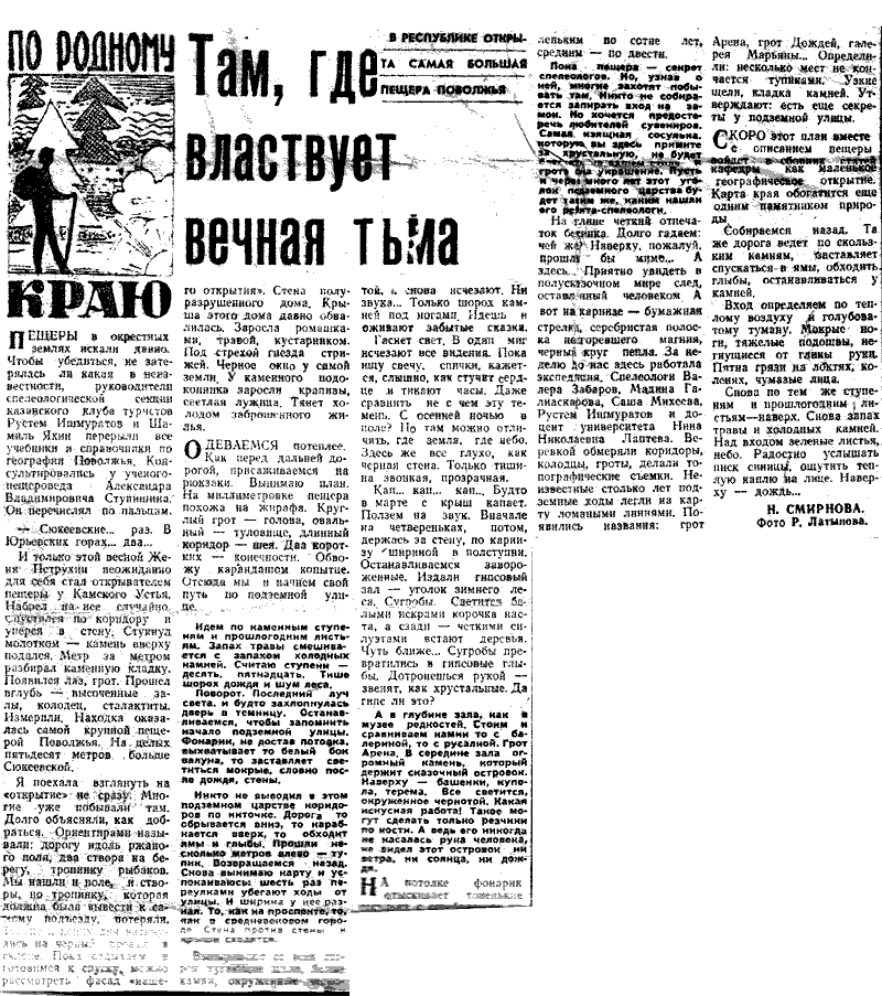 И только этой весной Женя Петрухин неожиданно для себя стал открывателем пещеры у Камского Устья. Набрел на нее случайно. Спустился по коридору и уткнулся в стену. Стукнул молотком - камень вверху подался. Метр за метром разбирал каменную кладку. Появился лаз, грот. Прошел в глубь - высоченные залы, колодец, сталактиты. Измерили. Находка оказалась самой крупной пещерой Поволжья. На целых пятьдесят метров больше Сюкеевской.
