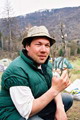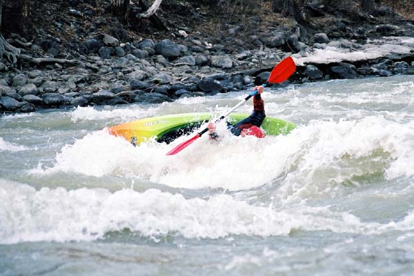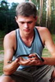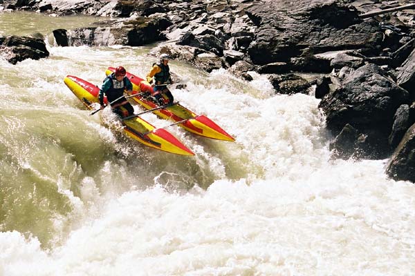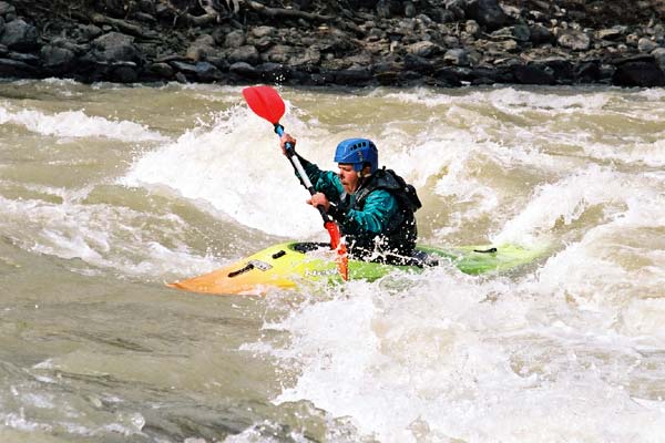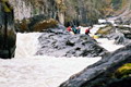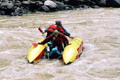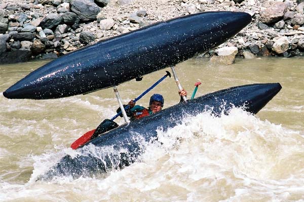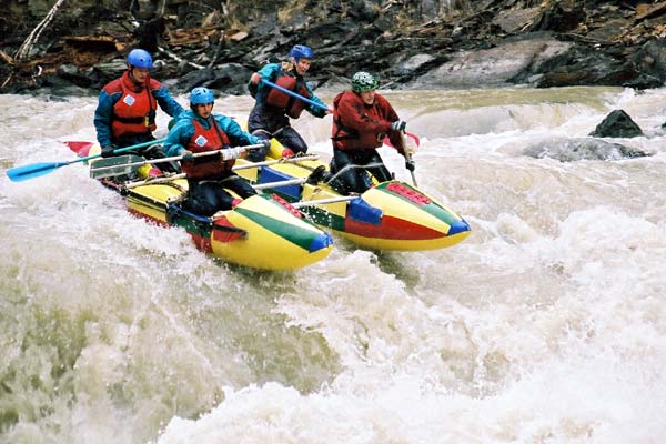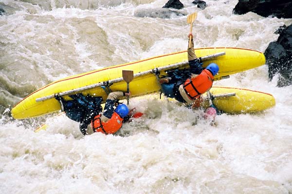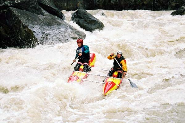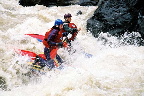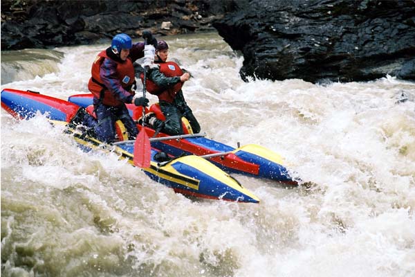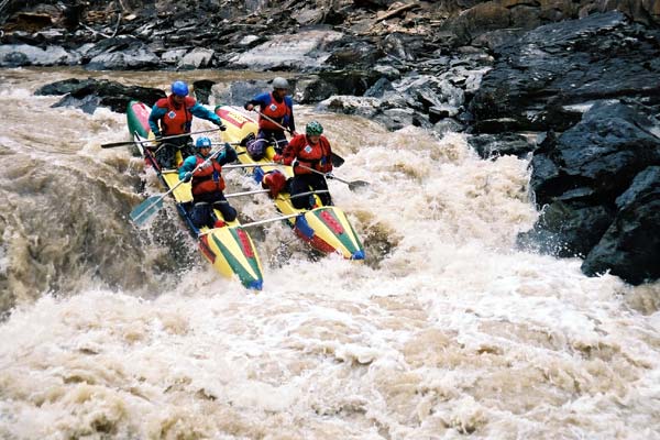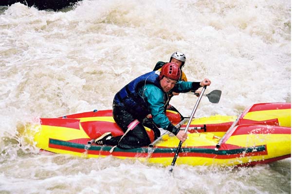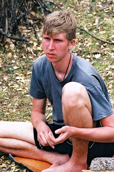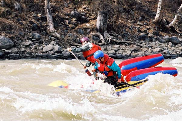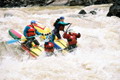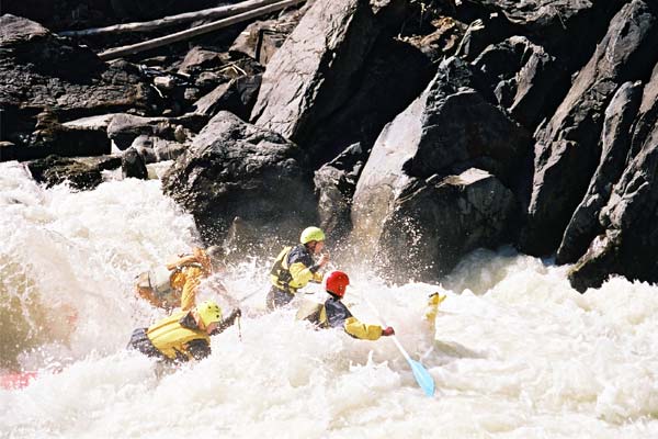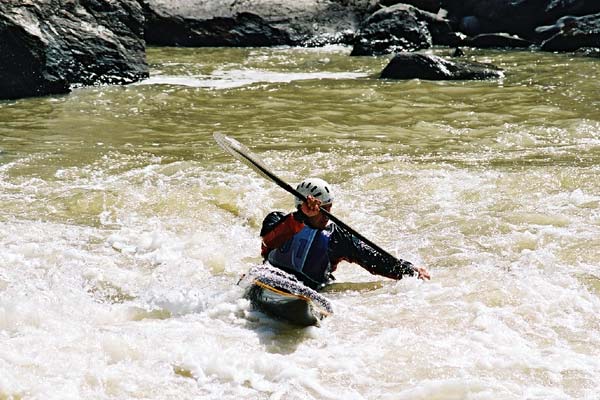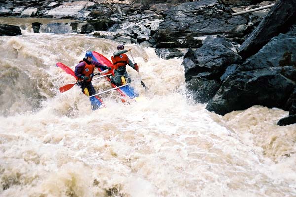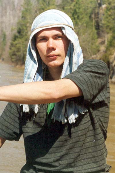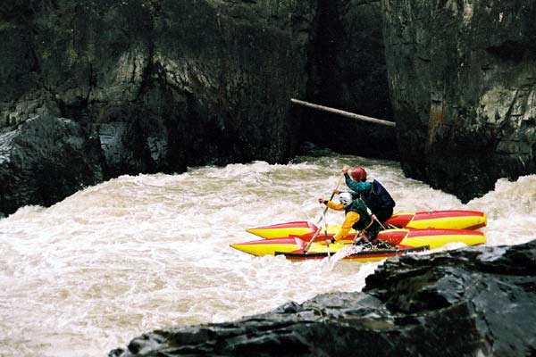 После этого Филипп пошел искать машину, которая отвезла бы нас на верх «Мажойского каскада», но все водители заломили такую цену, что проще было бы дойти пешком. Так никого не найдя, мы решили поискать машину утром, а сегодня снова пойти на «Малыш». Вместо Филиппа (так как он устал после соревнований) пошла Рита. Надо сказать, что чтобы дойти до порога надо взобраться по узкой тропке, продираясь через деревья и кустарник, на гору, а потом по такой же тропке спуститься к реке. Даже трудно сказать кому было легче идти, мне с Вовкой (мы несли двойку) или Филиппу, Женьке и Тимуру (они по очереди несли четверку), а Мила с Ритой несли четыре весла, фотоаппарат и лягушку. На месте мы были примерно половина седьмого. Филипп принял позу фотографа, а мы пошли готовиться. Позавчера, в первый раз, мы не спешили, шли медленно, а сейчас договорились идти быстро в режиме гонки, но не теряя друг друга из виду. Очередность судов такая же - четверка потом двойка. Сели в упоры, прокричали: «КАИ ПУП ЗЕМЛИ!!!», - и поплыли. Вода поднялась сантиметров на 20-25. Порог «Малыш» прошли нормально. В следующем пороге нас с Вовкой немного заклинило между двух камней (не пробили язык и лагом слились аккурат промеж двух камней), но, потыкавшись маленько веслами в камни, вышли на струю.