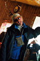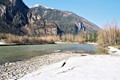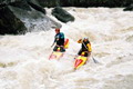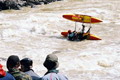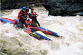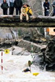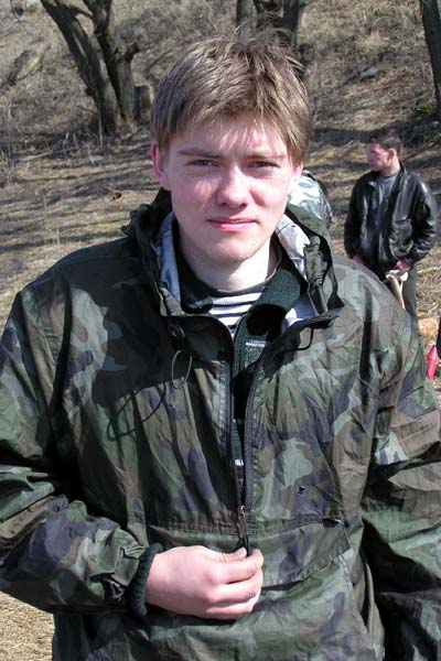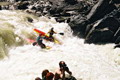 Ну так вот, вскоре увидели бублик. Его экипаж раздувал костер. Мы прошли мимо. Немного выше порога «Пирамида» увидели людей. Зачалились не доходя до них на другом берегу. Развели костер. Полчаса отдыхали и грелись (погода в этот день стояла холодная, а все наши вещи остались в базовом лагере). Мы предположили, что эти люди скорее всего из Уфы, т.к. накануне вечером Филипп ходил к ним (у них лагерь на финише первого этапа) по поводу транспорта. Там ему и сказали, что их люди уже второй день идут «Мажой» (они идут с разведкой). Погода начала портиться, стал накрапывать дождик. После отдыха подплыли к другому берегу. Да - это уфимцы. Договорились встретиться на «Пирамиде». Порог «Пирамида» мы проходили с разведкой и страховкой с берега, т.к на нем во время соревнований было больше всего оверкилей. Сначала шла четверка, Вовка и я стояли на страховке. Четверка прошла хорошо и встала на страховку - Женя с Филиппом на воде, Тимур с Милой на берегу. К моменту нашего с Вовой прохождения подоспели уфимцы, и попросили нас, чтобы мы их страховали. При прохождении порога «Пирамида» мы с Вовкой не сумели выгрести и нас снесло на ту самую пирамиду (здоровый кирпич посередине русла, стоящий на выходе из поворота, на который валит вся вода) и чуть не перевернуло, но все обошлось. Под углом ~60 градусов к воде я, скребя по камню веслом, и Вова, сидя по грудь воде и активно работая веслом, сумели выйти на струю и слились за камень. Вышли на берег и стали ждать уфимцев. После успешного прохождения их двух двоек (на одном из катамаранов сидел один человек по центру судна и греб как в лодке), наши экипажи отправились дальше. Четверка немного оторвалась вперед, а нашу двойку периодически догонял бублик. Нам это быстро надоело (шутка ли, такой слон маячит в «зеркале заднего вида», и норовит наехать на нас), мы с Вовкой «надавили на газ» и вскоре догнали нашу четверку. На мосту, где был финиш первого этапа соревнований, попозировали уфимцам на фото и видеокамеры. Они напоили нас горячим чаем, спросили про судьбу их сплавщиков. Мы сказали, что обошли их на «Пирамиде». Вскоре появился бублик. Гостеприимные уфимцы также угостили их чаем. Мелкий дождь меж тем стал противным постоянным фоном. Бублик пошел в порог «Президиум», а мы взяли каты на плечи и полезли по склону на дорогу. Часа через два пришли в базовый лагерь соревнований, там почти никого уже не было. Сделали «сухперекус». Примерно в шесть вечера сели на суда и отправились вниз по реке на порог «Бегемот».
