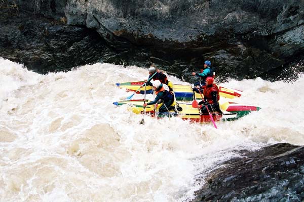 Утро шестого мая для нас началось примерно в обед. Мы неспеша поели, приготовили гидрокостюмы и вещи для сплава, катамаран двойку, стали ждать, попутно отгоняя коров от своих биваков. На финише очень интересно было слушать судейскую рацию, по которой очень весело судьи описывали прохождение дистанции участниками. Пришла наша четверка. По предварительным результатам они обогнали алтайцев, и были этому рады. Стали ждать двойку, но ее все не было и не было. Как выяснилось позже Костик и Тимыч снова кильнулись, на этот раз они слились по центру в пороге «Малыш». Там в этот день воды было намного больше, и образовался неслабый котел. В итоге приплыли они через час после прихода четверки. Как сказал потом Костя, их обоих смыло с катамарана, Костю затащило на дно (из-за малого объема спасика), а Тимур выплыл по поверхности из котла. После всего этого они оказались на одном берегу (если это можно назвать берегом; сидели на больших камнях, так как по стенкам каньона вскарабкаться нельзя) ниже «Малыша», а катамаран на другом берегу выше их по течению. Вот так они и сидели на камне, пока какой-то кат не перечалил их двойку. После небольшого самосплава они достигли судна, и приплыли на финиш даже не последними.