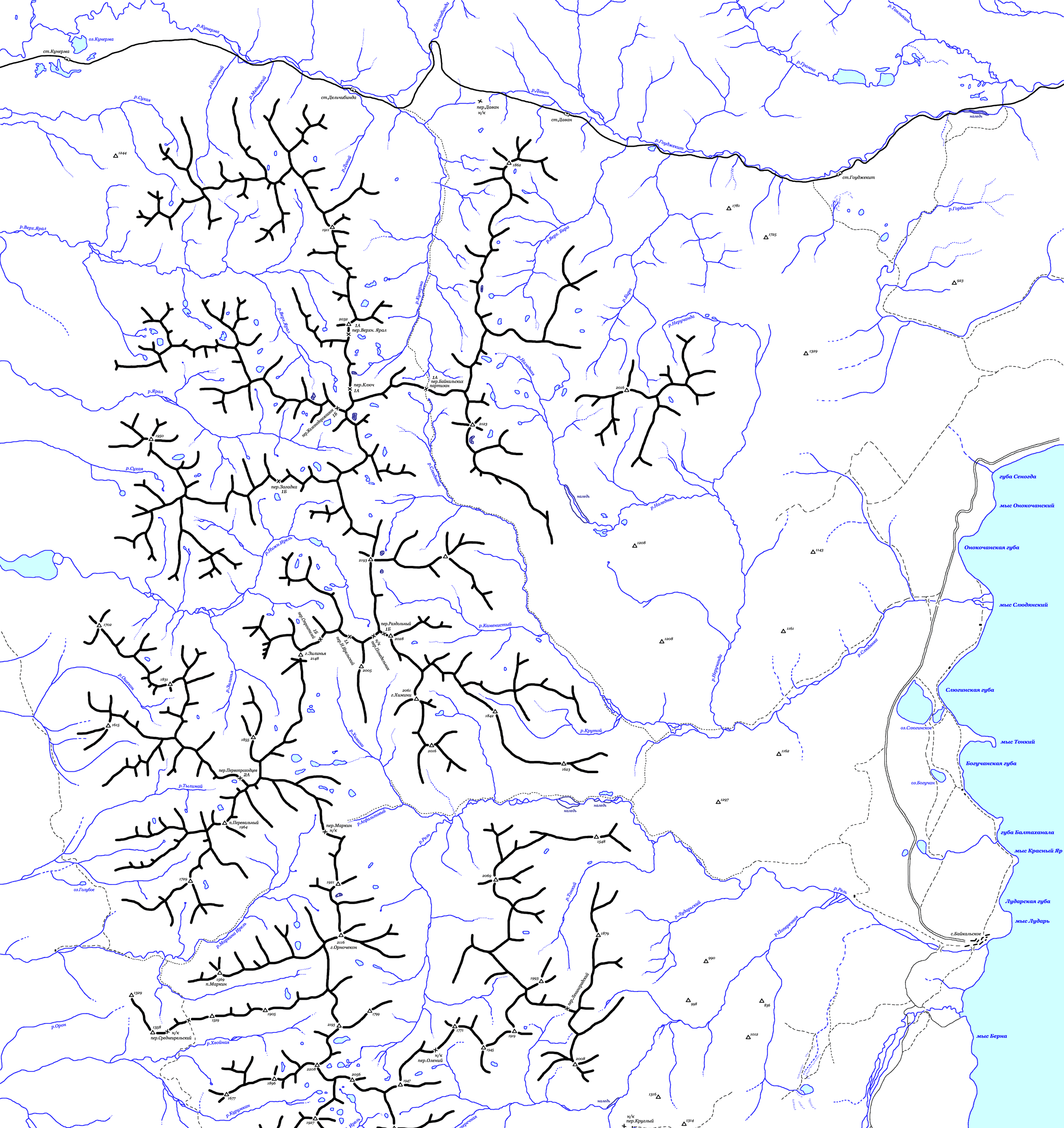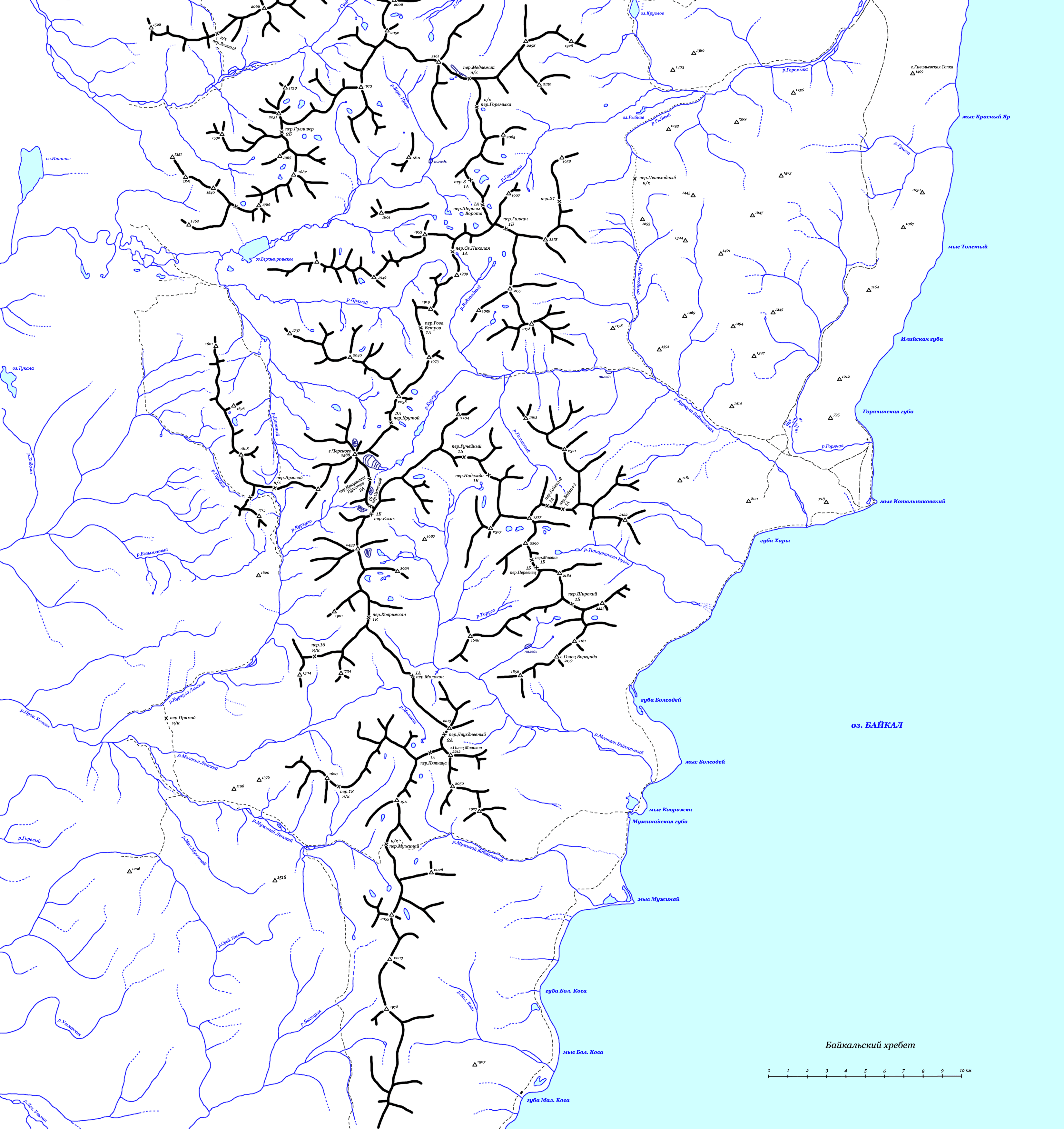 | Здесь приведена карта Байкальского хребта. В качестве основы для правки была взята карта-хребтовка из отчета о пешеходном походе 6 к.с. п/р Хайруллина И.З. (№348 в библиотеке ТССР). Топоосновой послужили карты масштаба 1:50000 с сайтов т/к КТМЗ и клуба туристов УГТУ-УПИ "Романтик", масштаба 1:100000 с сайта www.tourism.ru. | ||||||||||