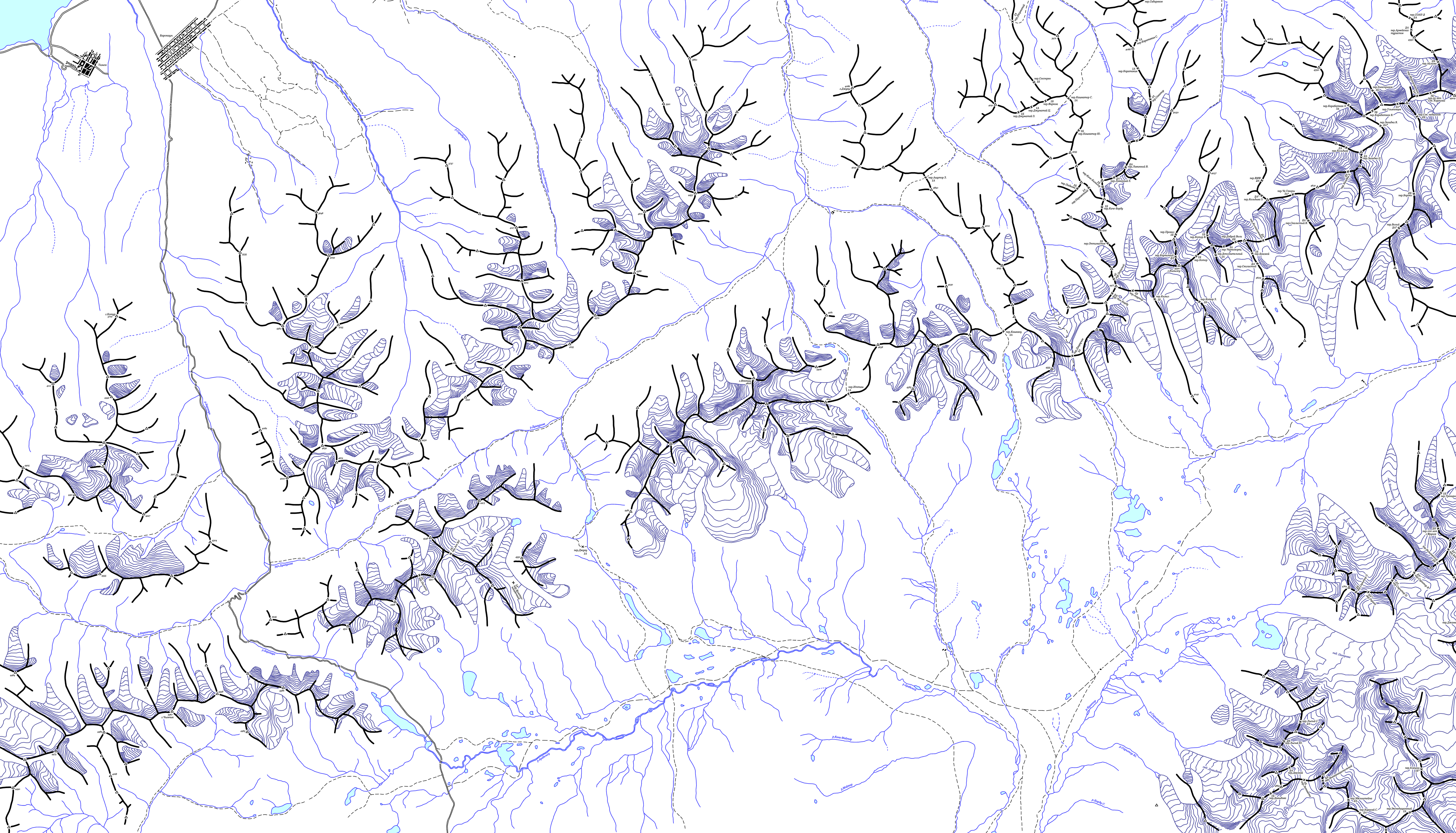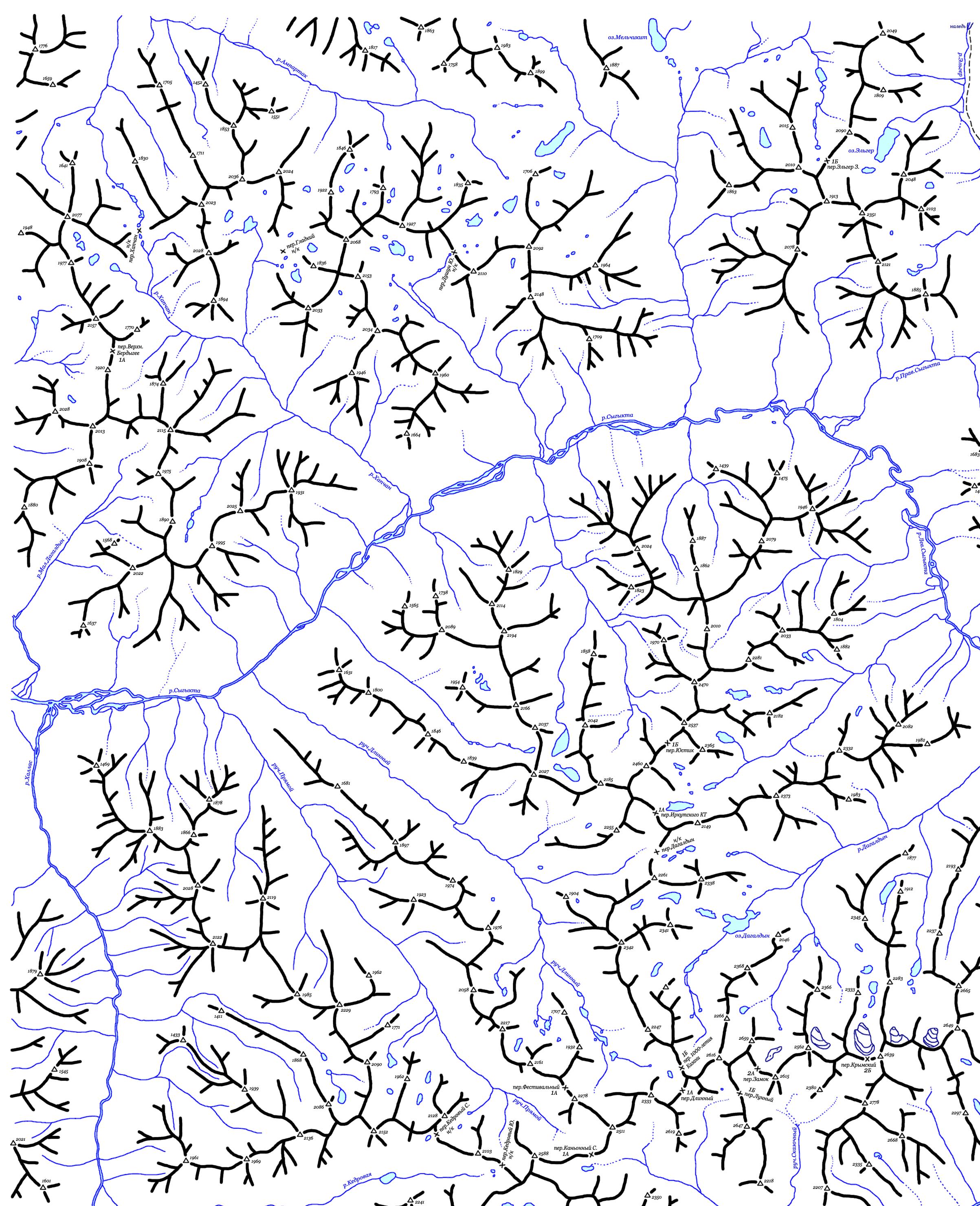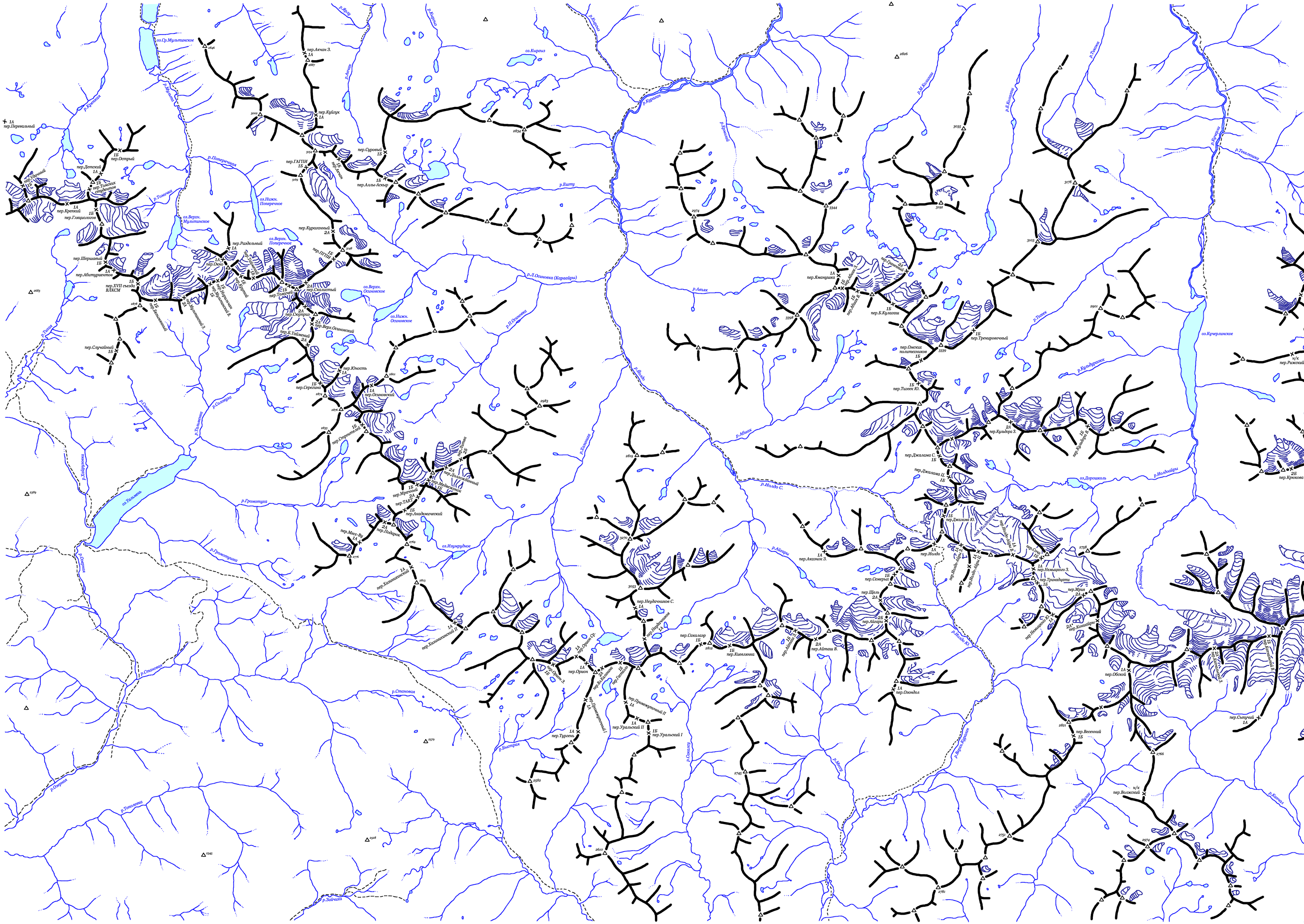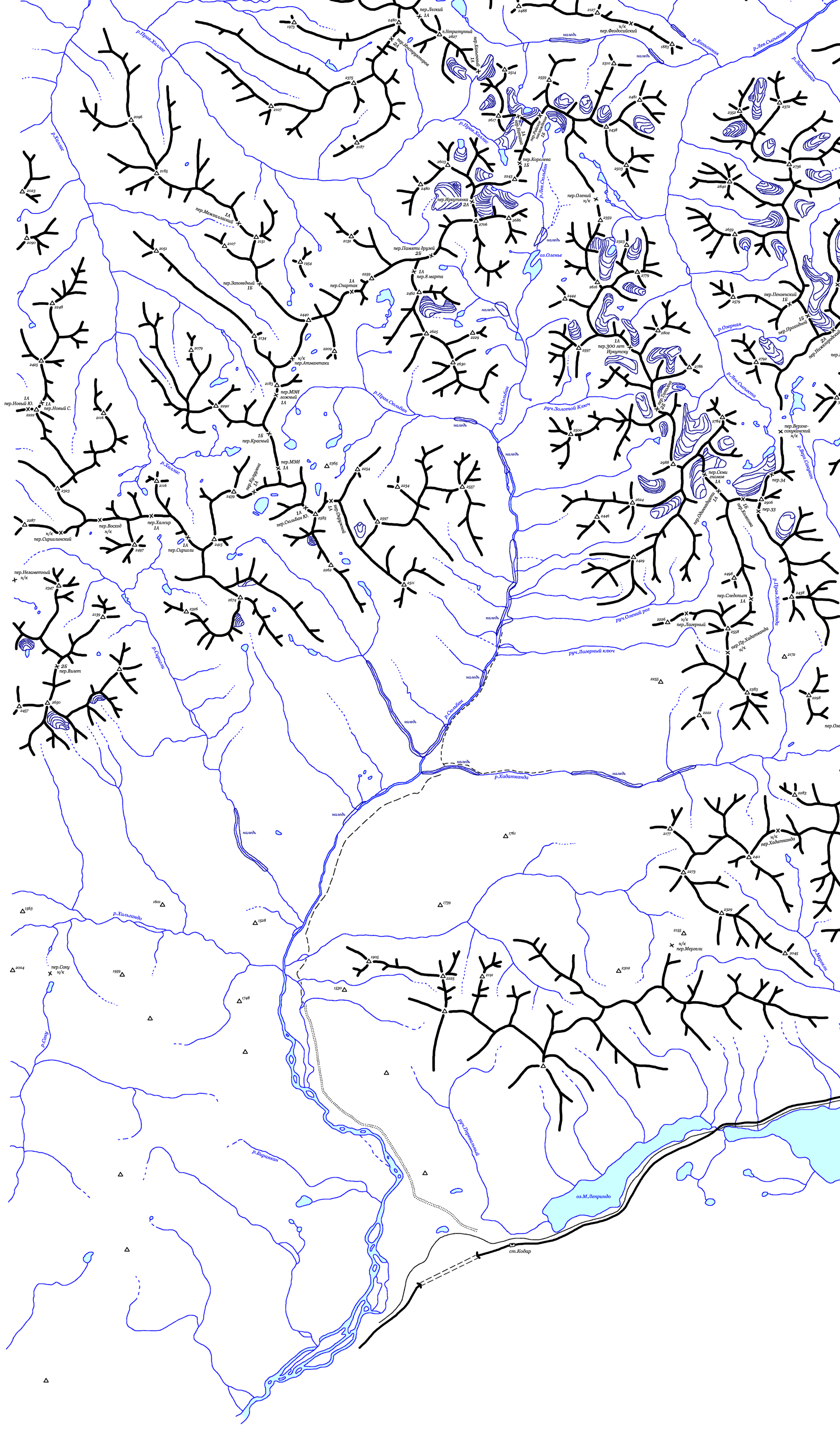 | Здесь приведена карта центральной части хребта Кодар. Топоосновой послужили карты масштаба 1:100000 с сайта www.tourism.ru. Расположение перевалов указано по картам Ляпина-Громова и Сенотрусова, а также по отчетам из библиотеки МГЦТК. (Последние изменения 14.10.2008). | ||||||||||