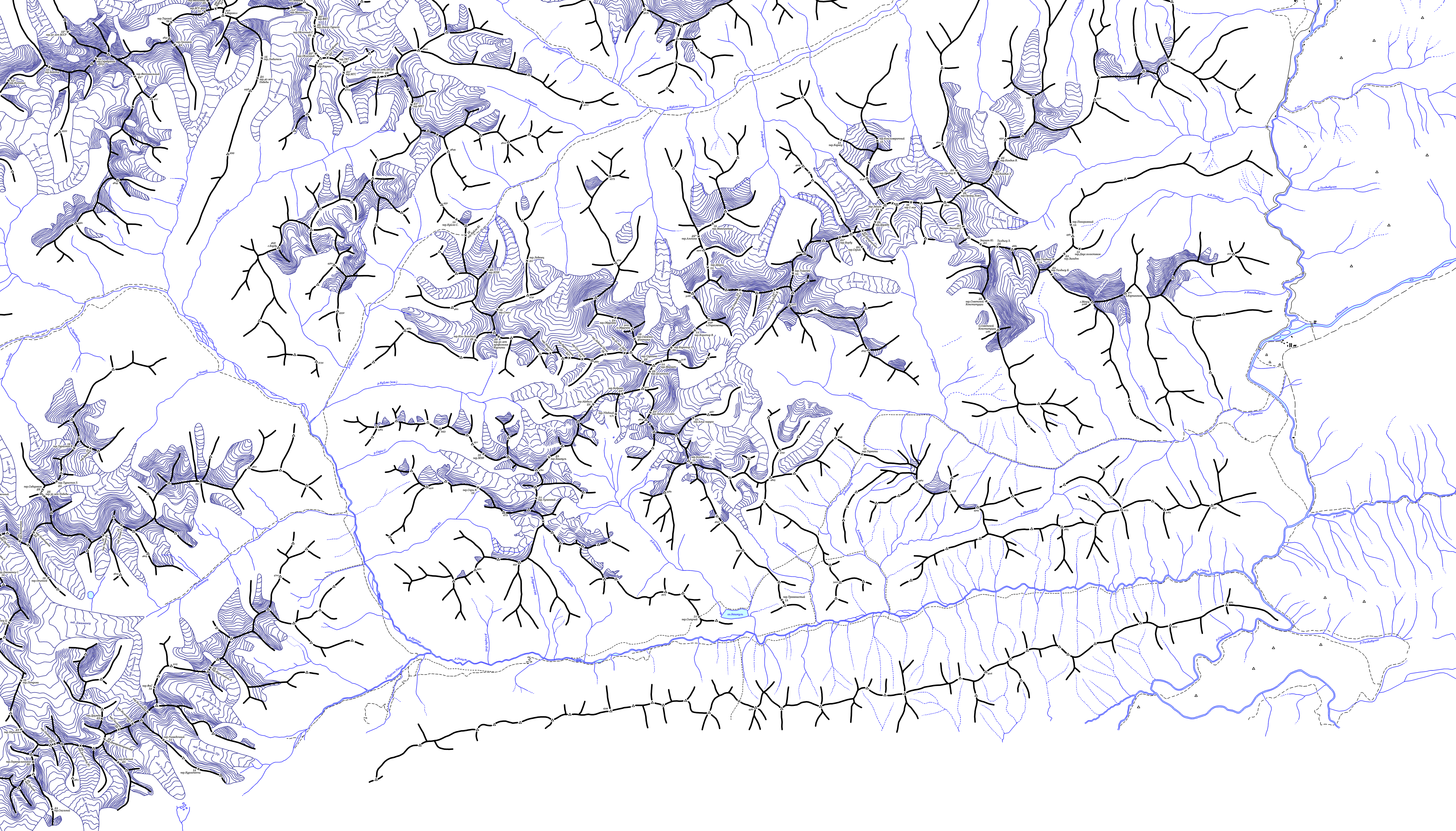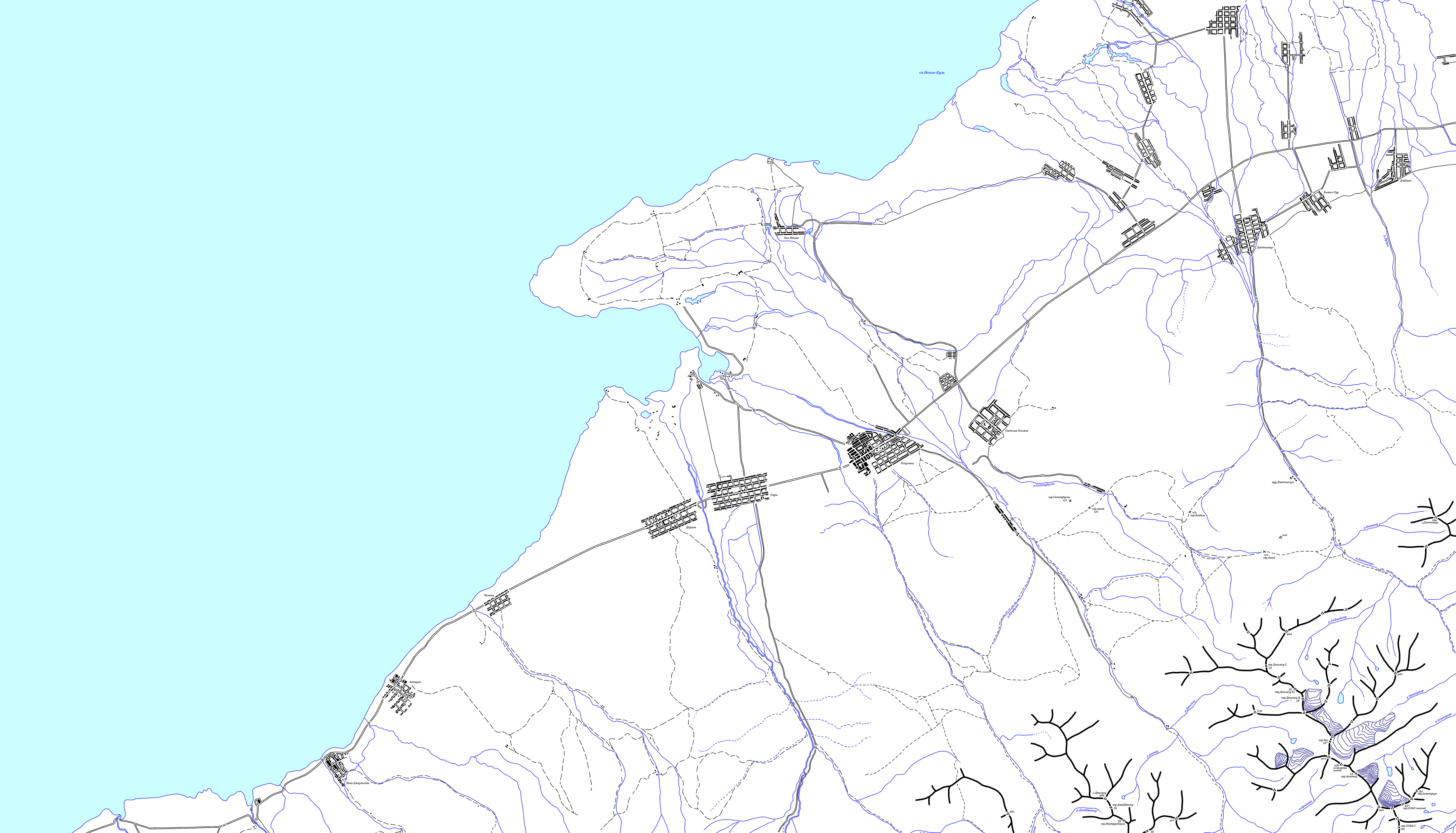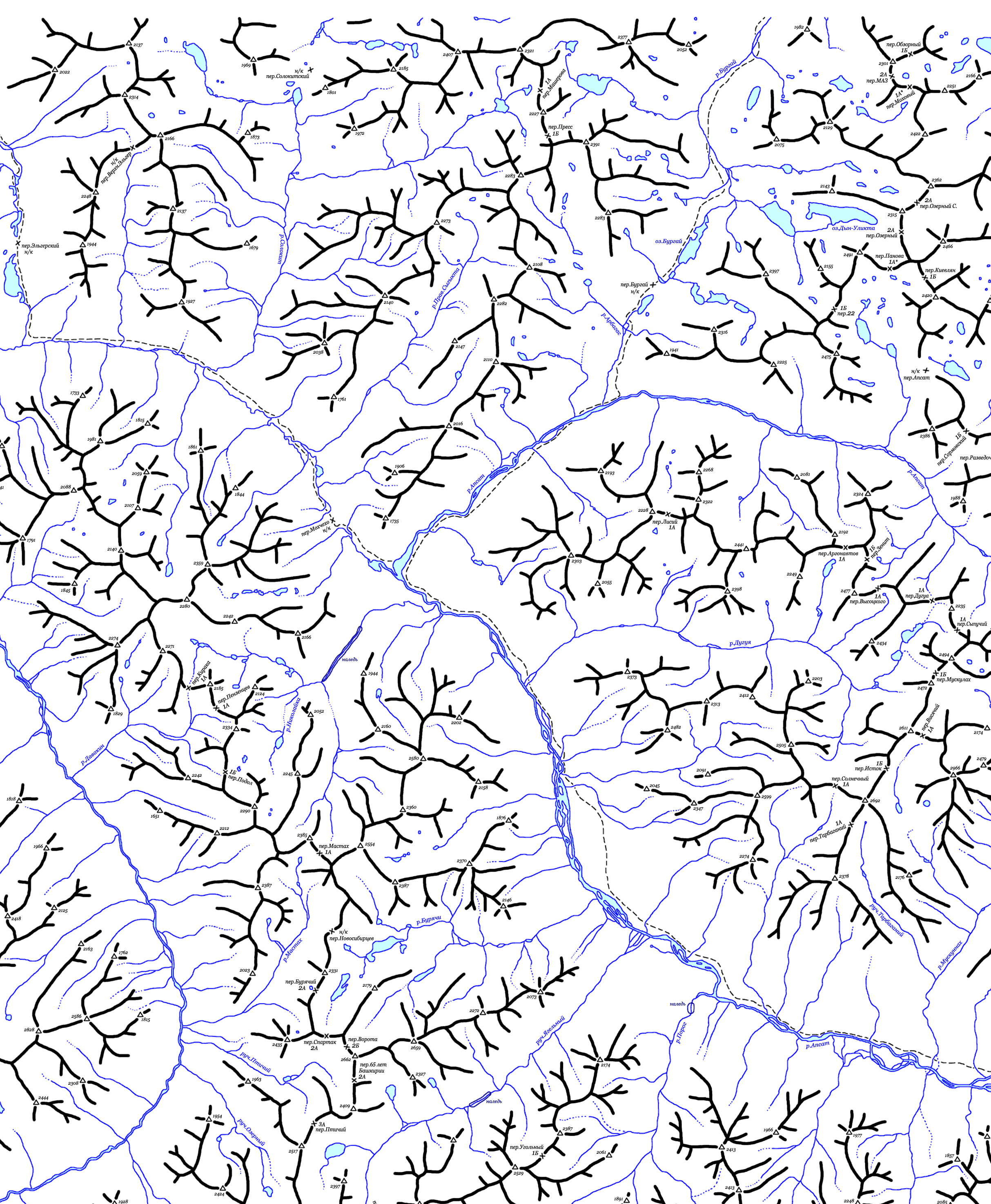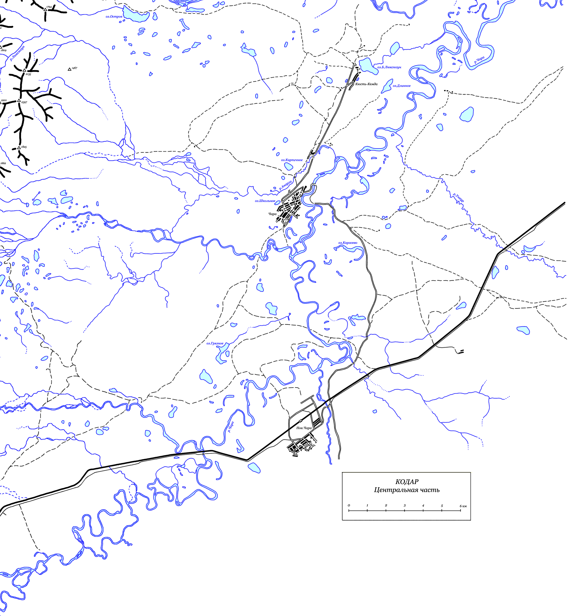 | Здесь приведена карта центральной части хребта Кодар. Топоосновой послужили карты масштаба 1:100000 с сайта www.tourism.ru. Расположение перевалов указано по картам Ляпина-Громова и Сенотрусова, а также по отчетам из библиотеки МГЦТК. (Последние изменения 14.10.2008). | ||||||||||