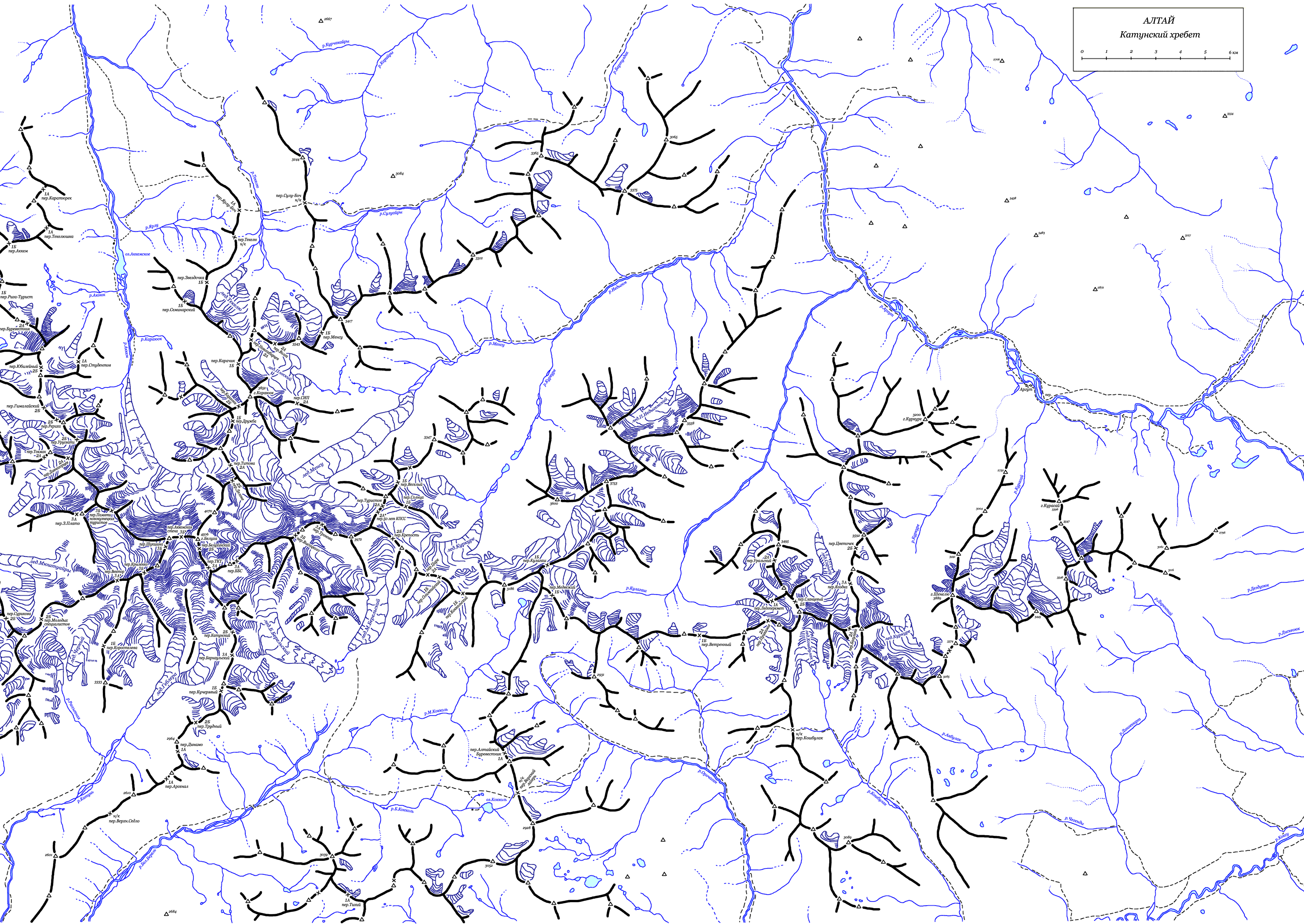 | Здесь приведена карта центральной части Катунского хребта Алтая. В качестве основы для правки была взята карта-хребтовка Катунских белков (Уфа-1986), а также топооснова масштаба 1:100000. Местоположение отдельных перевалов уточнялось по карте с сайта Второй Школы. (Последние изменения 07.04.2007). | ||||||||||