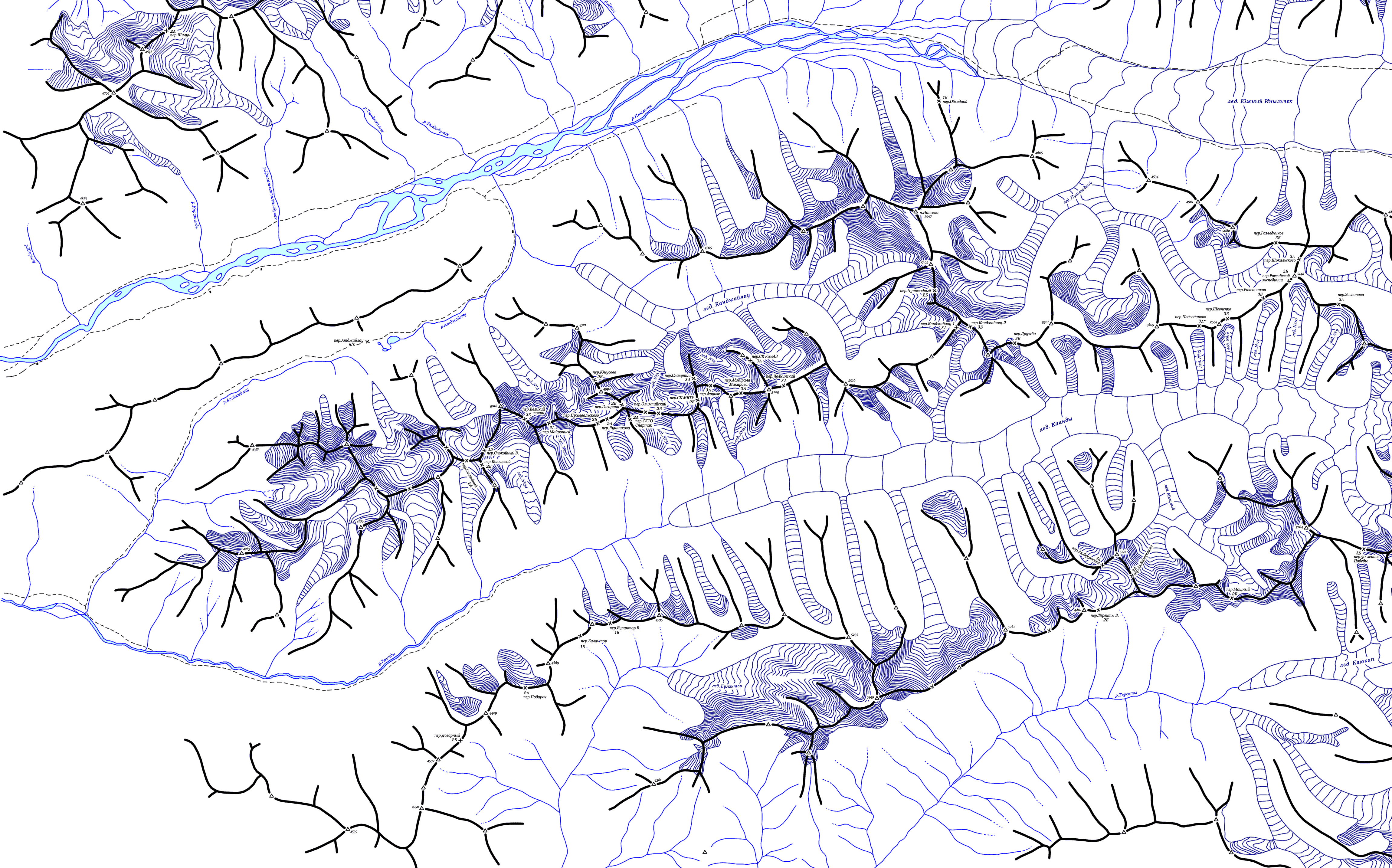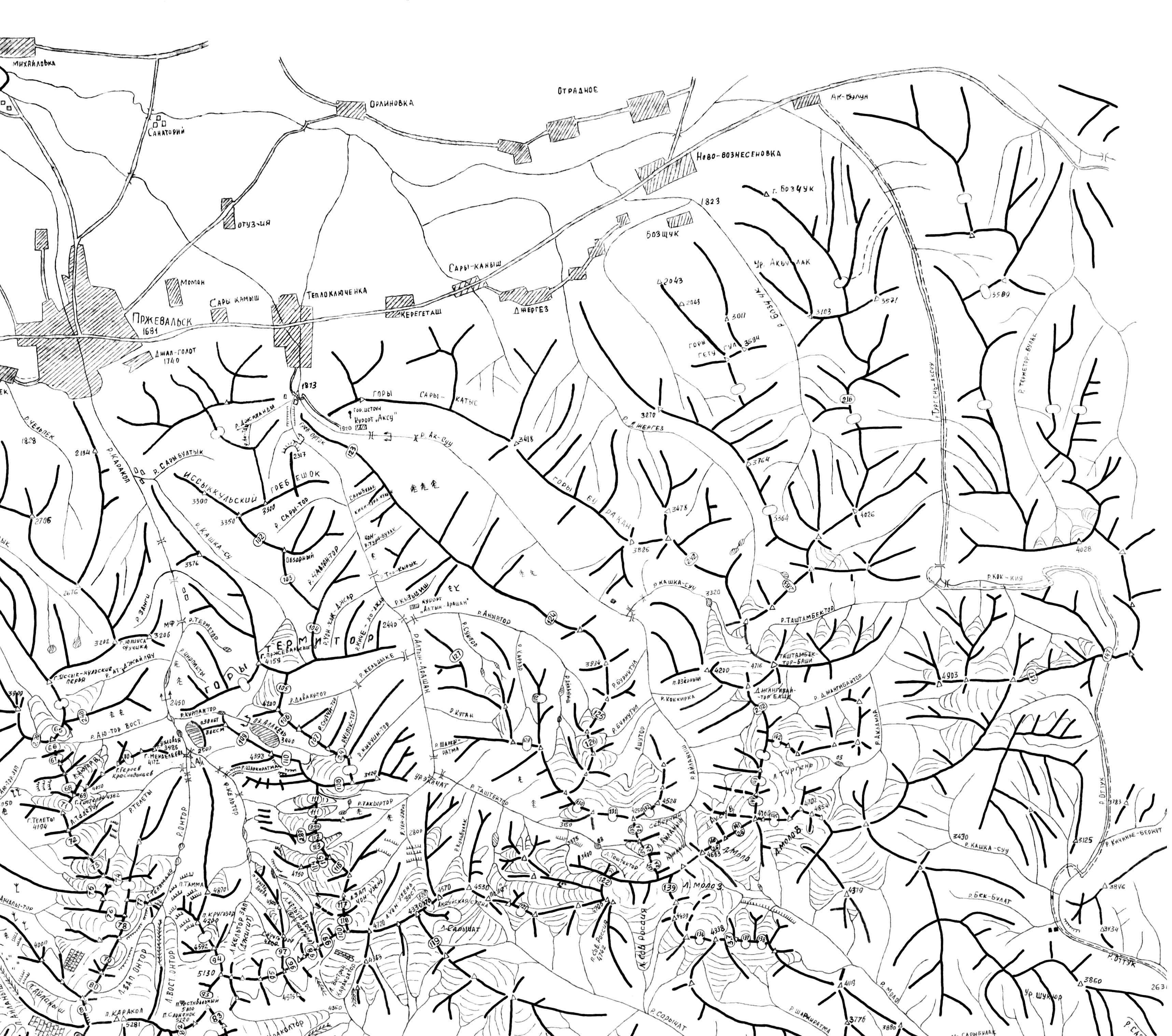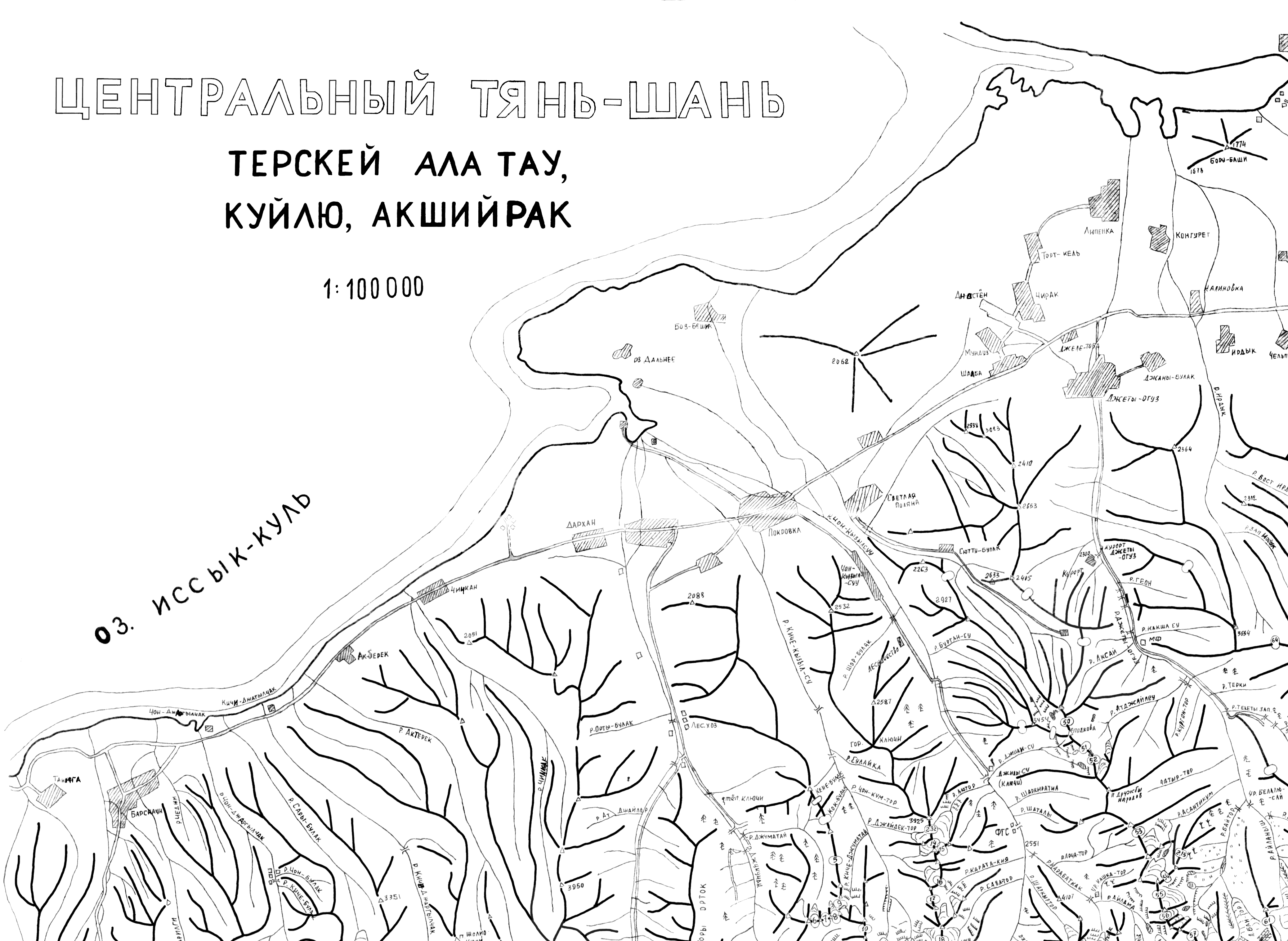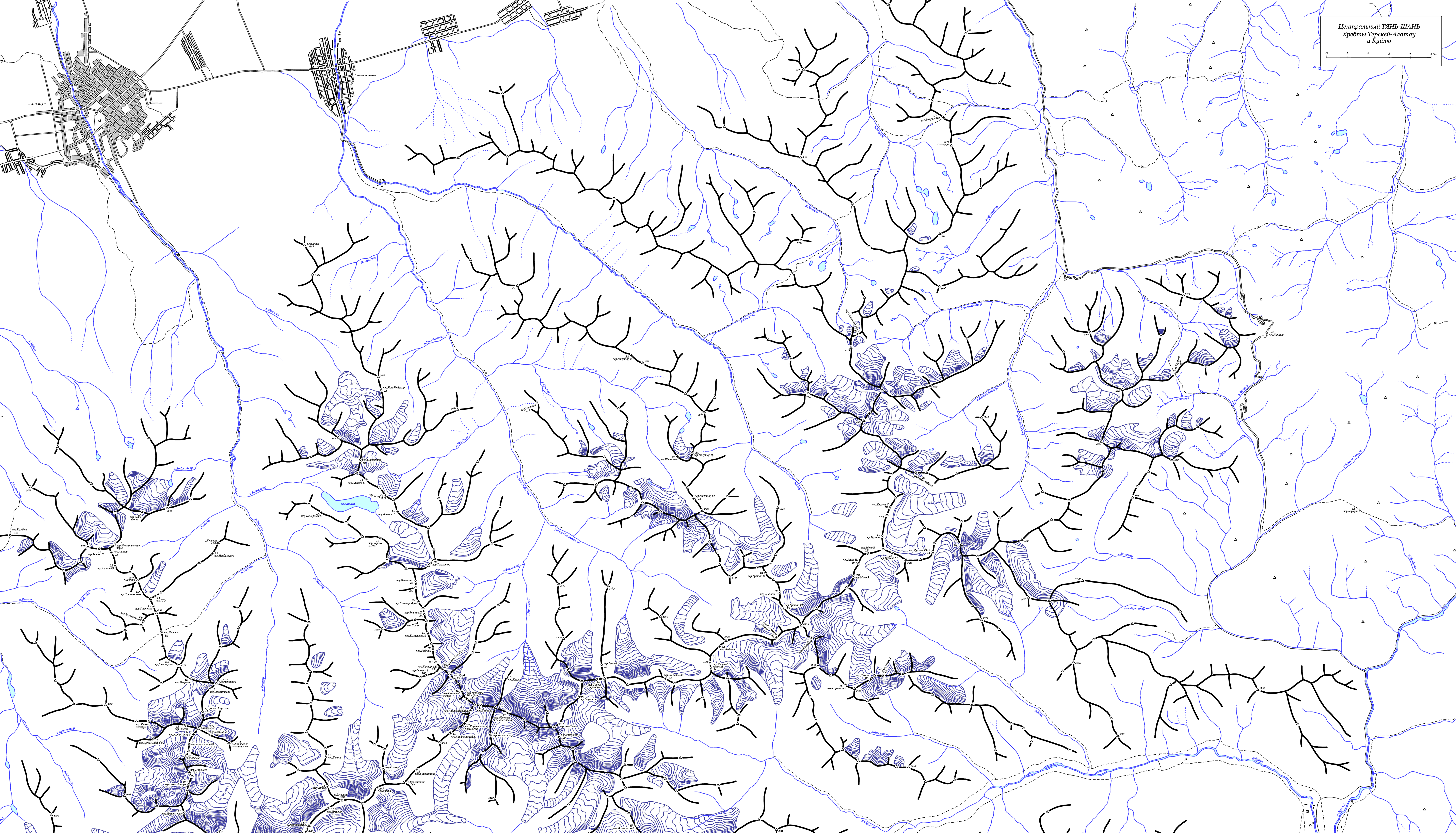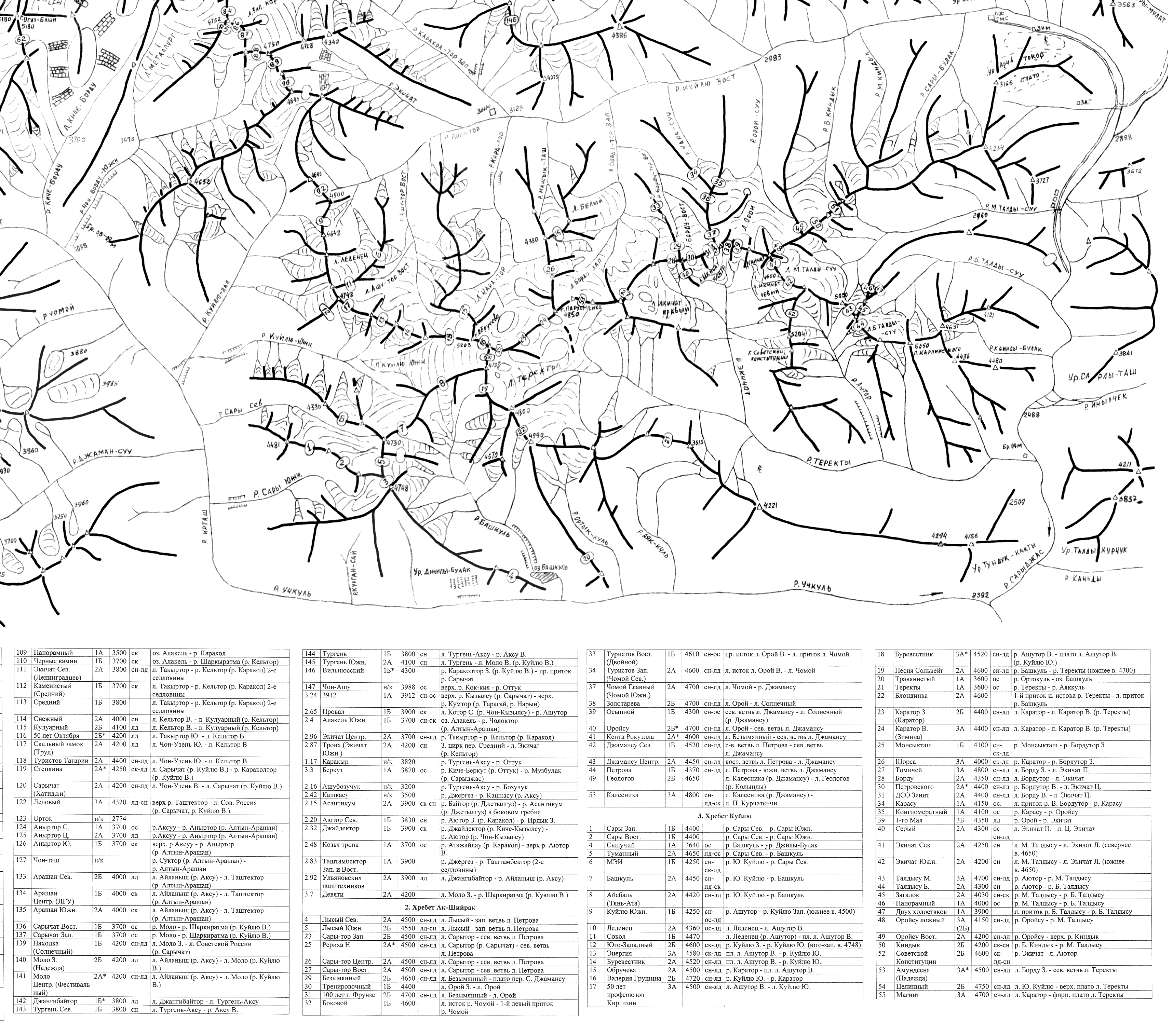 | Здесь приведена карта-хребтовка хребтов Терскей-Алатау и Куйлю Центрального Тянь-Шаня. Топоосновой послужили карты масштаба 1:100000, местонахождение перевалов перенесено с вышеприведенной схемы и из отчетов из библиотеки МГЦТК. Имеется некоторое расхождение данной топоосновы с другими источниками. (Последние изменения 22.04.2009). | ||||||||||