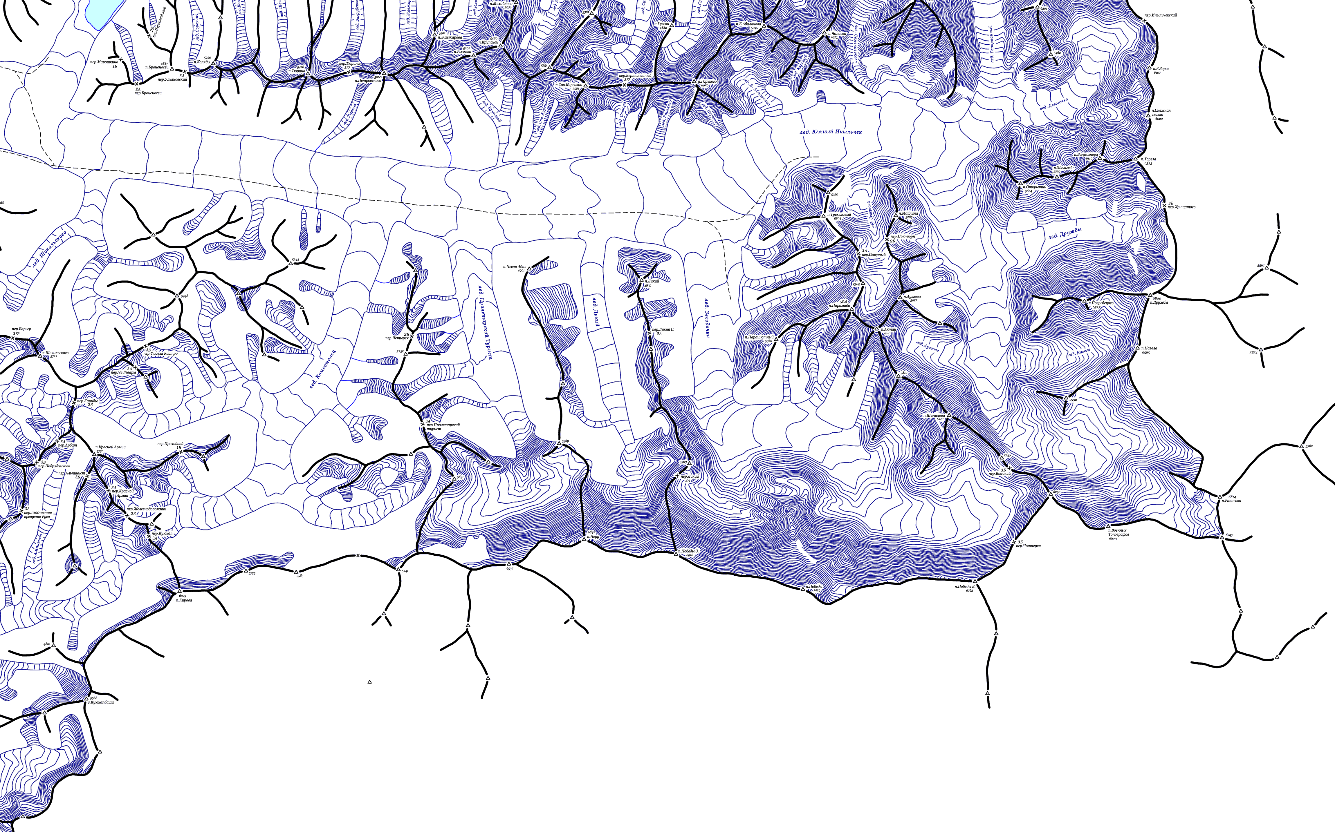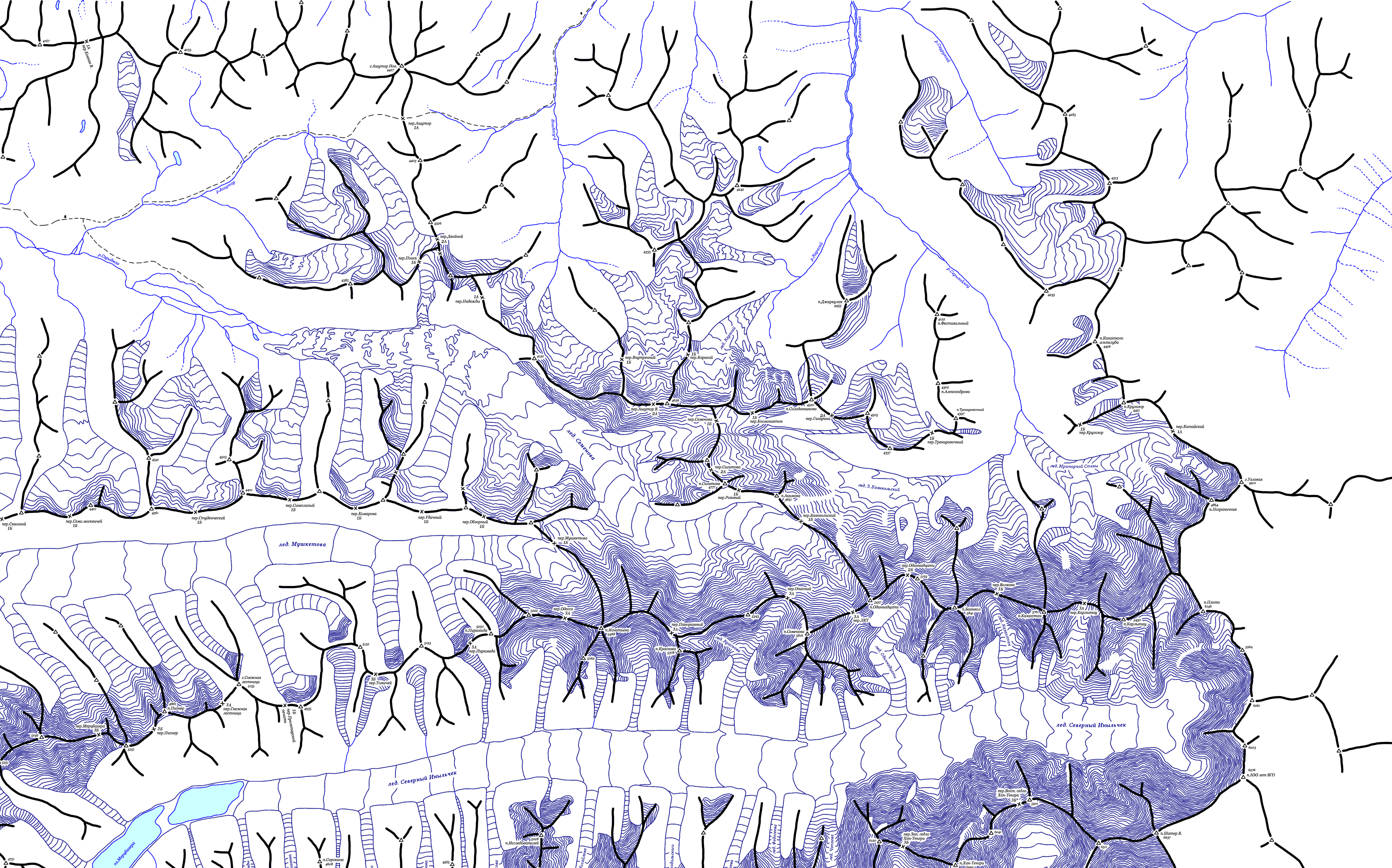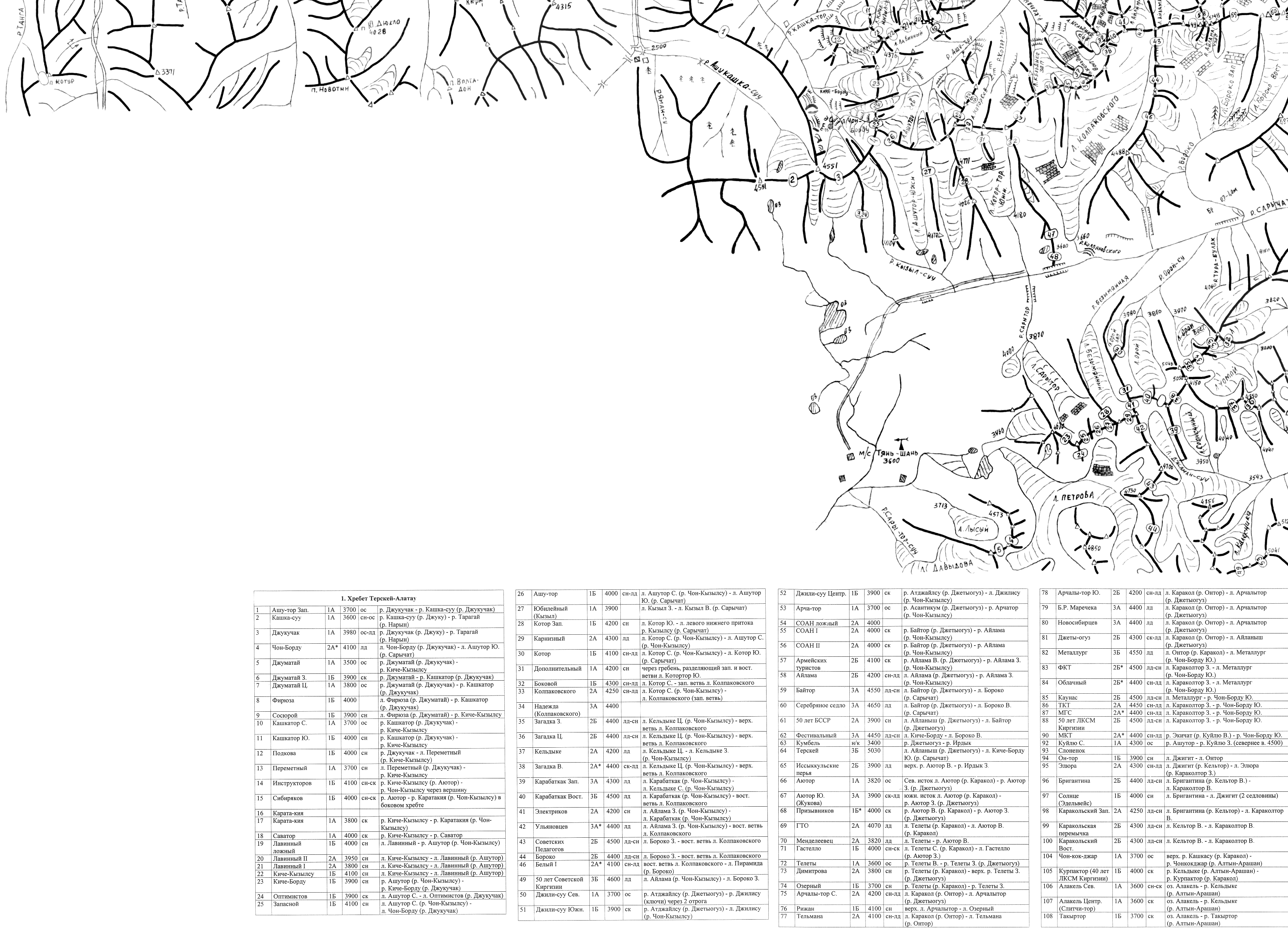 | Здесь приведена карта-хребтовка восточной части Центрального Тянь-Шаня. Топоосновой послужили карты масштаба 1:100000, местонахождение перевалов и вершин перенесено со схемы В. Попчиковского и из отчетов из библиотеки МГЦТК. Часть вершин не перенесена из-за существенного расхождения исходной схемы и топоосновы. (Последние изменения 26.04.2009). | ||||||||||