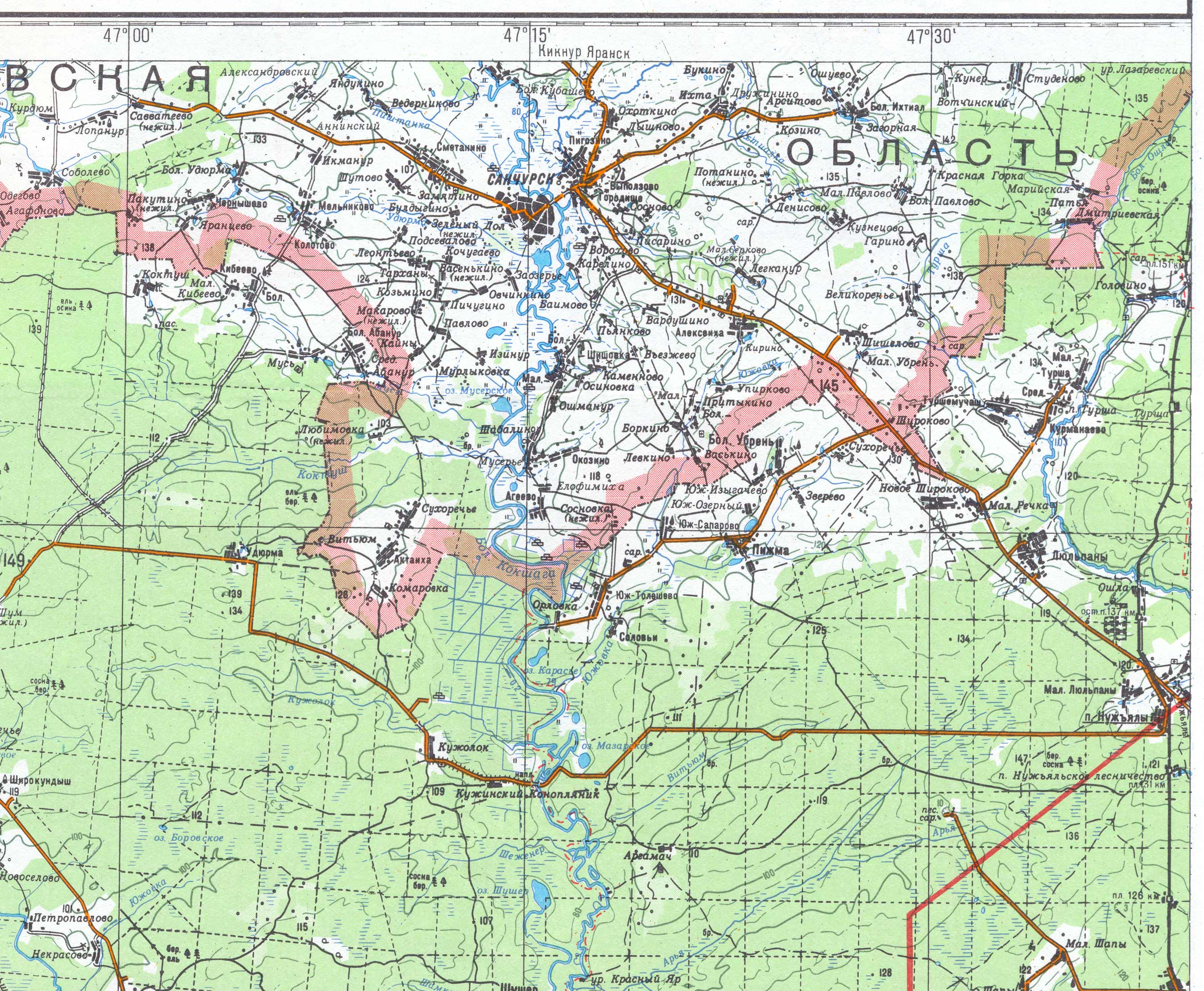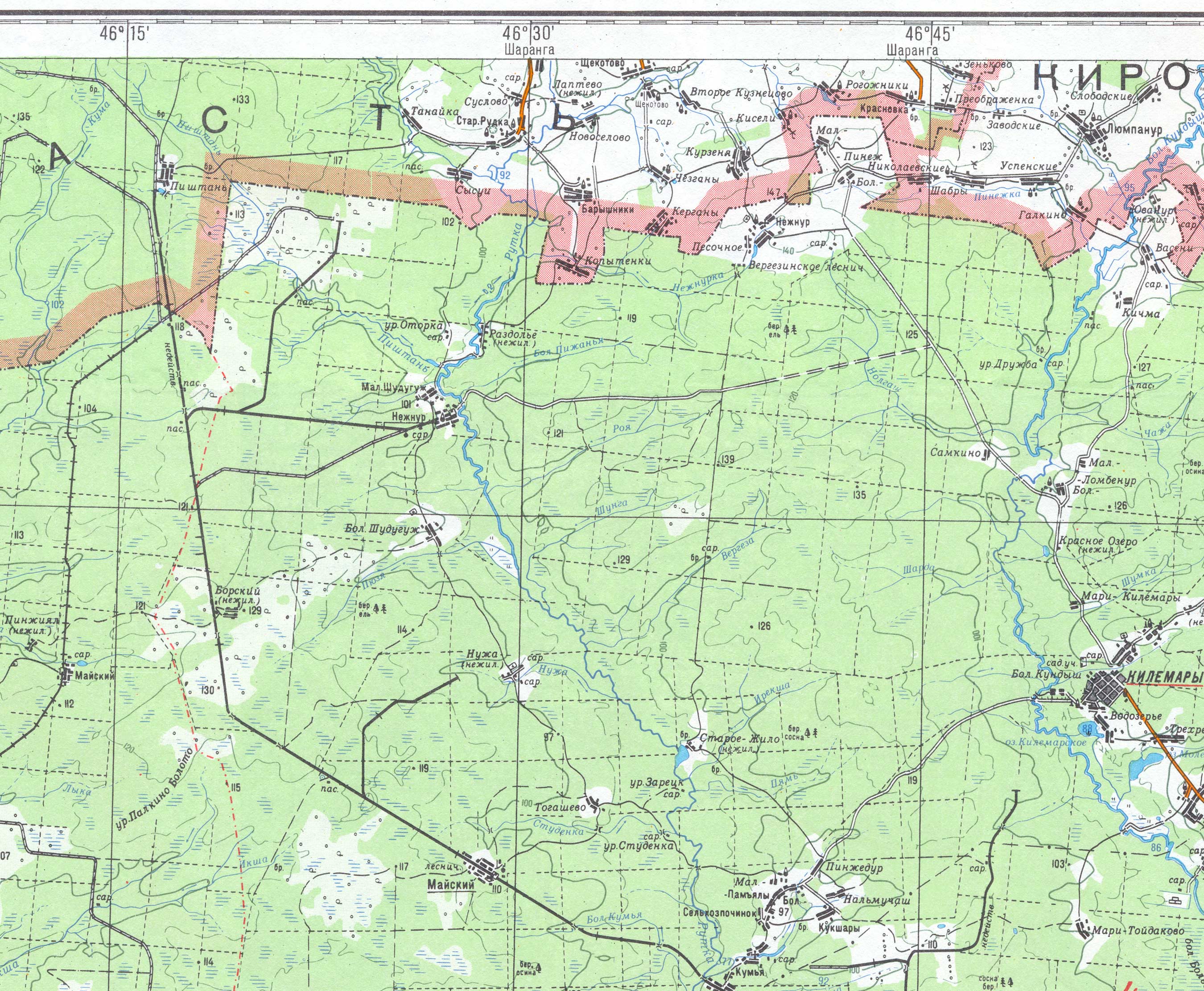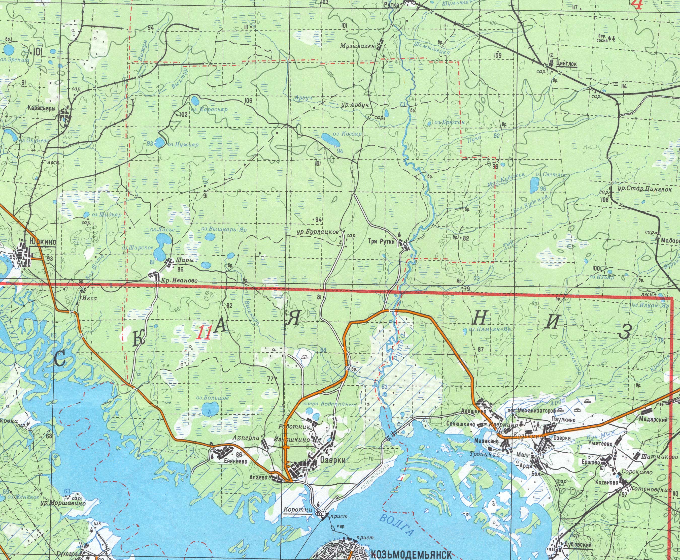 | Здесь приведена западная часть географической карты Марий Эл масштаба 1:200000. (Последние изменения 16.04.2005). | ||||||||||