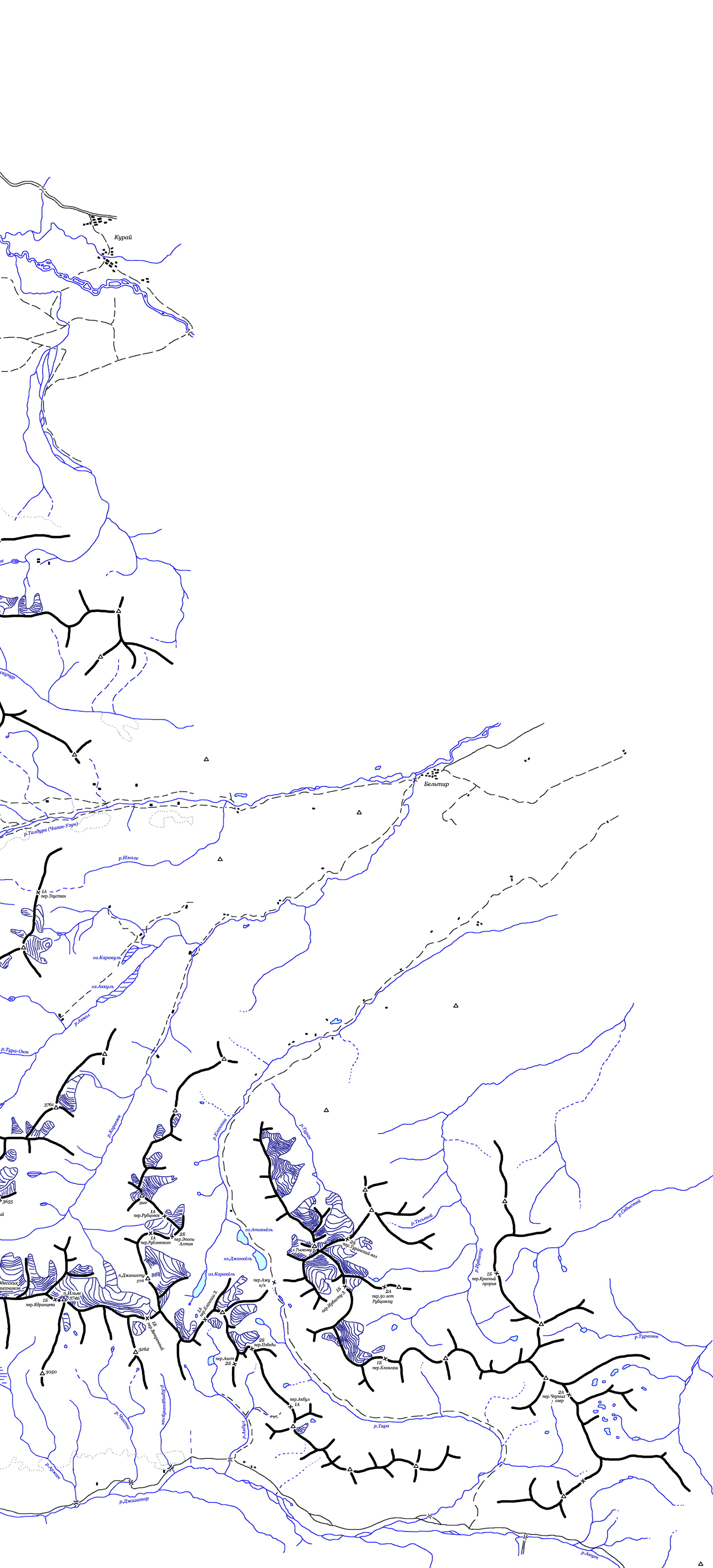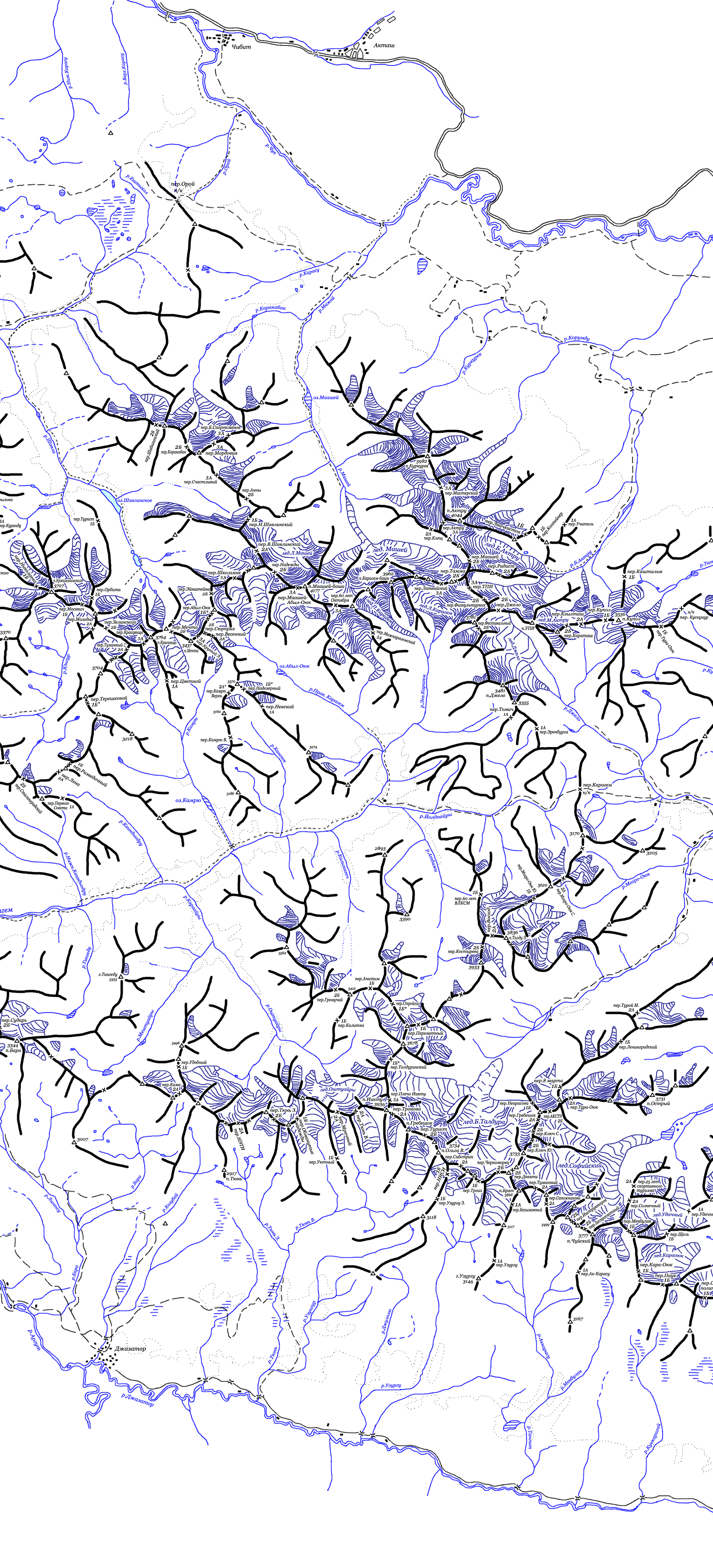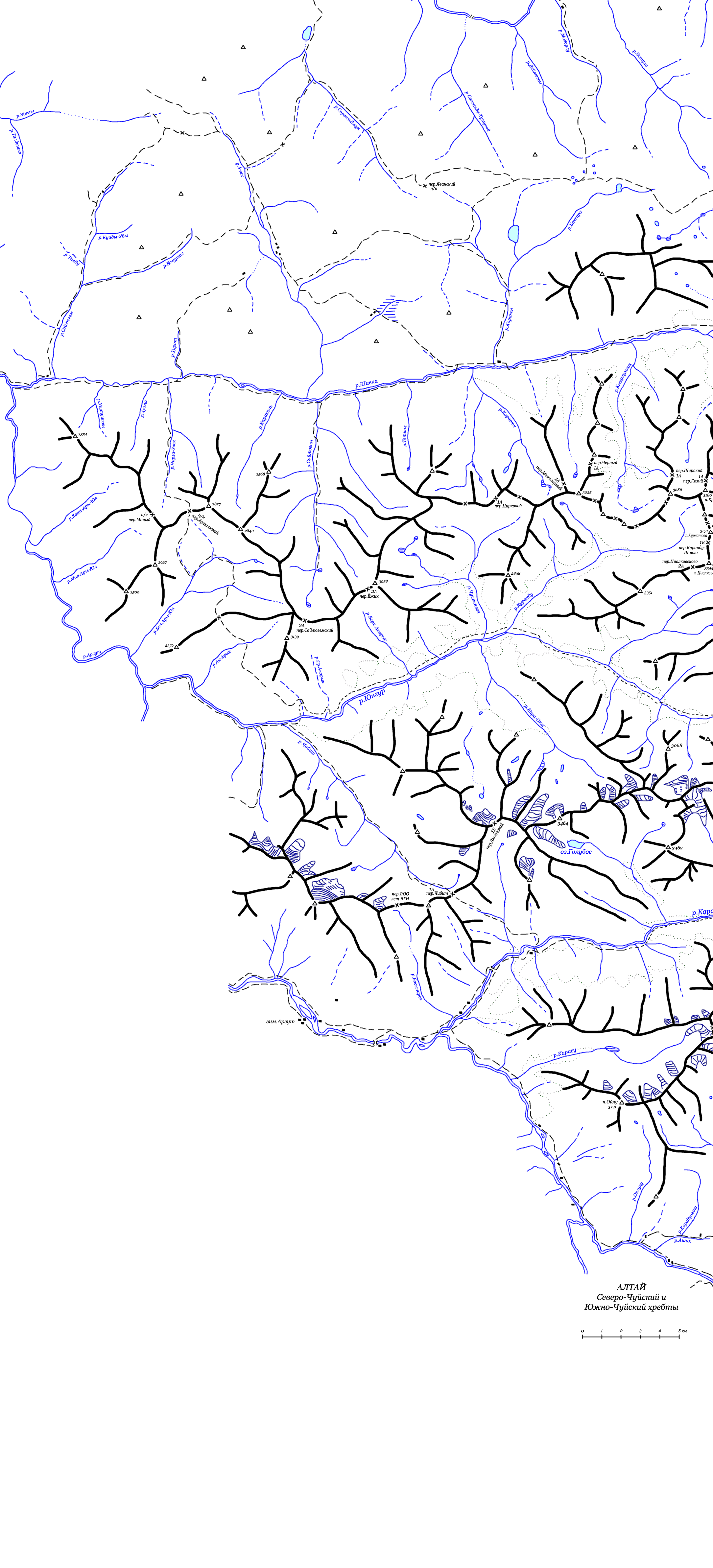 Здесь приведена карта Северо-Чуйского и Южно-Чуйского хребтов Алтая.