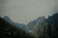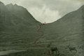 Прижим с водопадом обходим по крутому левому борту долины и оказываемся перед следующим водопадом. Опять поднимаемся по каменистому кулуару повыше к камням и идем пологим траверсом вверх по долине (фото 41). Через 55 мин. подходим к травянистым площадкам. Иногда в разрывах облаков видно понижение впереди наш перевал (фото 42). Сильный ветер, температура 9°С. Еще полчаса занимает путь до перевального взлета. Здесь есть площадки, пригодные для ночлега, но без дров, так как граница леса осталась далеко внизу, у второго водопада.