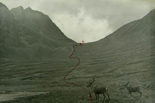 Устье правого истока, куда мы должны идти, спускается по наклонной террасе каскадом ледопадов. Выше террасы скальные обнажения сжали его так, что ручей вынужден сливаться через это препятствие, образуя ледопад метров пять. На подходе завалы леса и глубокий снег. В половодье Хильгандо - опасная река. На русло нам лезть не пришлось. Следы оленьего каравана обошли это препятствие боковым склоном, перевалили его и пологий спуск вывел нас на искомый ручей, далее тянулся заглаженный мягкий рельеф. Русло ручья в мелкой долине, обрамленное осыпными склонами. Левым поворотом оно вывело нас на обширный водораздел Хильгандо и Куды-Малой. Все время впереди нас следы оленьего каравана. Мы давно поняли, что это транзитный след и потеряли надежду увидеть эвенков на Хильгандо. Стоянок их не было негде. На стрелке истоков есть остатки палаток и чума, но это стойка геологов. И сразу, как перевалили по следу в правый исток, заметили остатки базового лагеря геофизиков, несколько остов палаток и футбольные ворота.