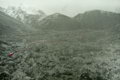 Поднимаемся по склону из подвижных камней с одновременным траверсом. Выйдя на левобережную морену, встречаемся с хозяином этих мест - крупным медведем, который поднялся нам навстречу с противоположной стороны морены. Видя, что медведь катастрофически близко приближается к нам, хором издаем воинствующий возглас после которого он остановился, удивленно осмотрелся и, повернув назад, обратился в бегство. Мы же продолжая подъем, выходим к скалам.
