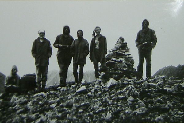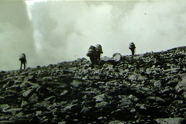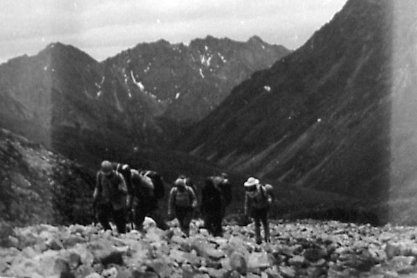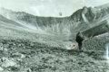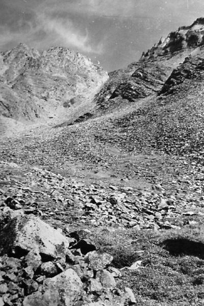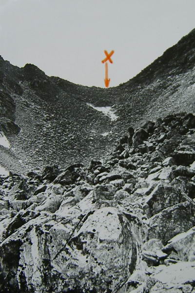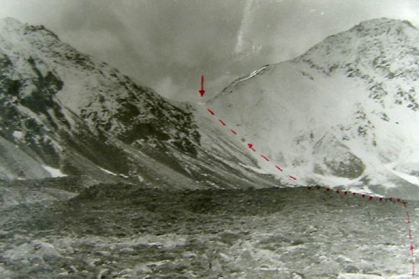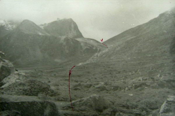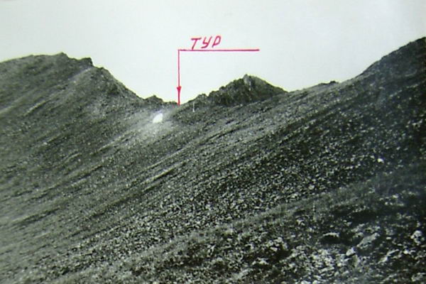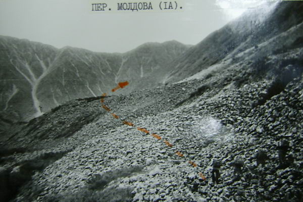 С моренного взлета хорошо просматривается верховье р. Дугуа (фото 62). По хаосу нагромождения камней проходим в цирк. Несколько небольших озер. Вслед за ними небольшая ровная травянистая площадка, рядом небольшой кусочек ивнякового кустарника. Верховье просматривается хорошо (фото 63). Прямо по центру седловина пройденного днями перевала группой тернопольцев и названного ими Аргонавтов. Оценен как 1Б к.с. Слева одна из наших седловин. Подъем на нее по предварительной нашей визуальной оценке не так прост. Решаем идти дальше. По моренным выносам выходим к большому озеру (примерно 200 на 80-90 м). От него четко видна левая седловина, одна из заявленных на первопрохождение (фото 64). Предварительная оценка подъема с этой стороны 1Б к.с. Подъем по крутому осыпному кулуару. От озера хорошо виден пер. Аргонавтов (фото 65). Решаем сначала сделать разведку правой седловины и уходим в верховье. Озеро обходим левым бортом долины повыше по склону (в этом месте к реке скальные сбросы) траверсом по средней и мелкой, местами живой, осыпи. Верховье цирка травянисто-каменистое. Видна наша седловина (фото 66). Подъем несложен. пологий набор высоты по средней и мелкой осыпи, крутизна 25-30°. Принимаем решение делать подъем без разведки. Через переход вышли на седловину (фото 67) и к нашему большому изумлению увидели тур. В нем записка группы из Минска под руководством Кажуро В. от 29.07.81г. Здесь нас опередили на три года.