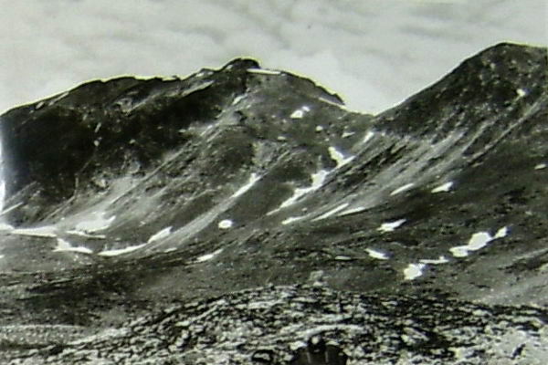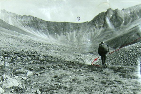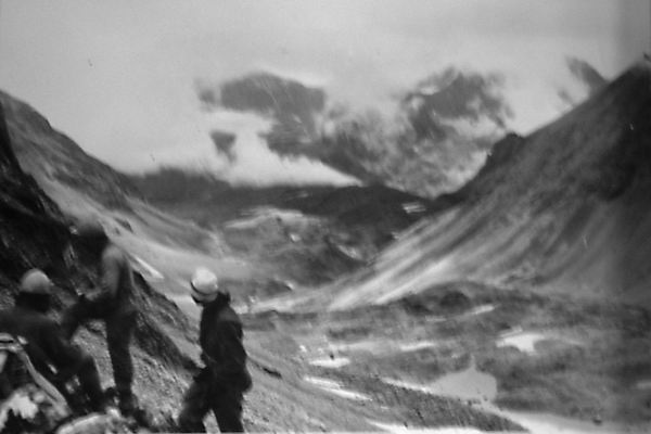 Пойма ручья из-под перевала болотистая, несколько рукавов. Седловина нашего перевала немножко за отрожком. С утра туман, закрывающий гребни и седловины перевалов. По травянисто-каменистому склону уходим под перевал. Туман стал немного подниматься, и приоткрылся пер. Спартак (фото 50). Траверсируем склон по крупной осыпи и подходим под перевальный взлет. Подъем начинаем по выраженному отрожку между двумя кулуарами. В касках, отстрел камней. Выше стенка, проходим по ней траверсом влево 15 м и поднимаемся по самому кулуару. Крутизна до 50°. Обойдя скальный выступ, по ответвлению отрожка по задернованным скальным полкам поднимаемся выше и выходим на большую скальную полку, где вполне хватает места всей группе, и место безопасно от возможных камнепадов. Кругом сильно разрушенные скалы. Через седловину ветер погнал туман. 40 мин. пережидаем. Туман также быстро и растянуло. Делаем разведку. После этого уходим траверсом влево по скальным полкам 60 м и выходим на ровную широкую седловину, что явилось для нас полной неожиданностью. На подъем затратили 2 часа. В туре (фото 51) записка г. Волгограда от 17.07.83г. под руководством Каплуновой Е.В., которая сняла записку минчан под руководством Евстратенко от 1981 года. Маршрутная книжка волгоградцев - 40-83, поход IV к.с. Отлично открылся с появлением солнца цирк и сточное озеро р. Птичий (фото 52).