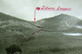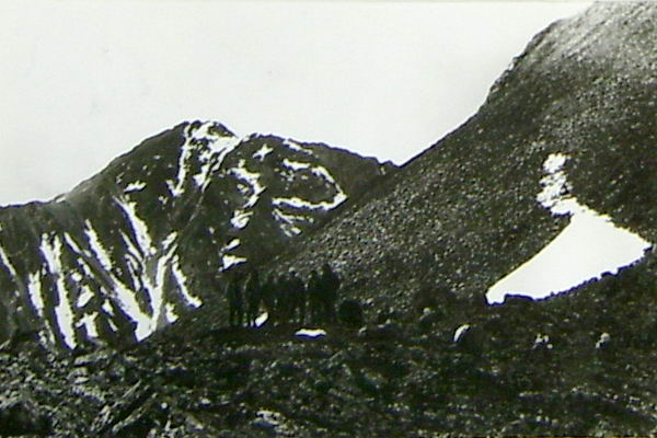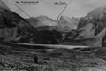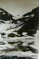 Подъем проходил по крутому травянистому склону, переходящему в верхней части в скально-осыпной. Через 40 минут подъема выходим к небольшому озеру, почти полностью покрытому льдом. От озера пересекаем большой снежник (фото 25), примыкающий вплотную к озеру, и по осыпи поднимаемся на седловину (точка А фото 25), считая ее перевалом. Наверху отдыхаем и ищем тур с запиской. Тура не нашли.