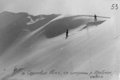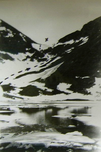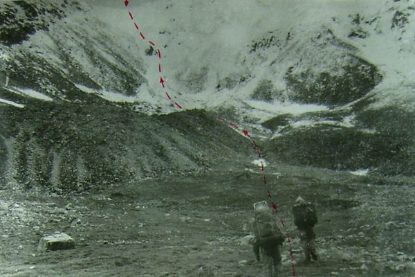 Спуск на лыжах занял 1 час. Движение серпантинами по 30-35° склону, спускающемуся к реке 4-я громадными ступенями. Большое затруднение вызывают каменистые участки, перегораживающие путь. Только благодаря большому снежному покрову и надежным лыжам спуск удался. Лавиноопасности нет.