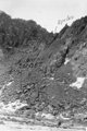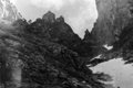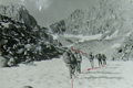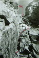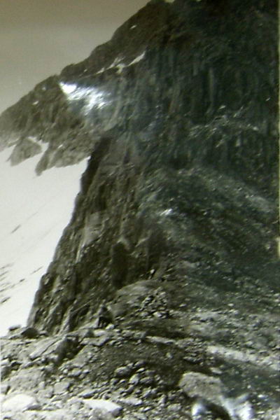 Высота перевала от лед. Тимашева - около 100 метров, из которых 90 м - средняя и мелкая очень живая осыпь (фото 34). Поэтому лучше всего подниматься, прижимаясь к левой границе скал и осыпи. Из-за большой камнеопасности мы поднимались "перебежками" по одному, пока остальные хоронились за выступами скал. В верхней части подъема, которую можно преодолеть свободным лазанием, для ускорения повесили одну веревку и поднялись спортивным способом на седловину, где находится тур и могут разместиться 2-3 человека.