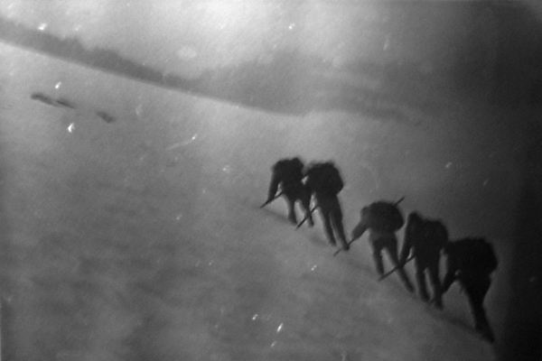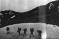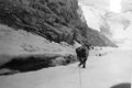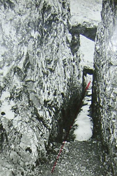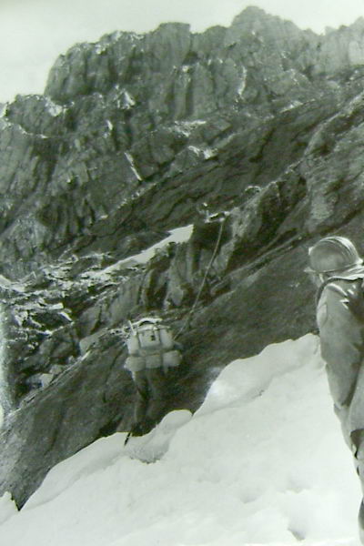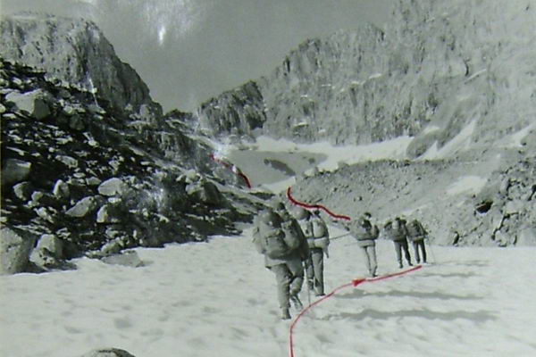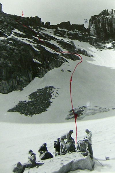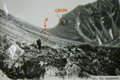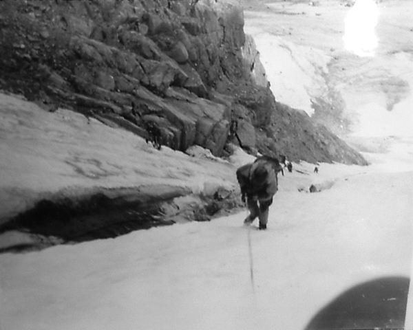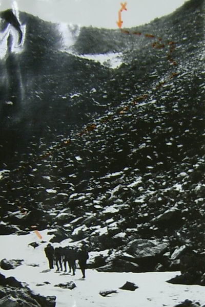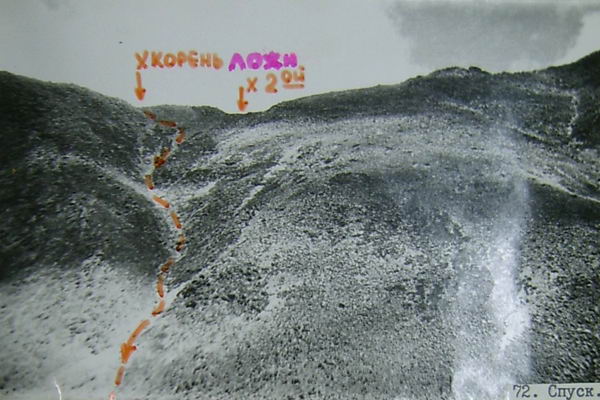 Спуск вели также с перильной страховкой; последний спускался с нижней страховкой. На спуск затратили 3 часа.