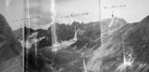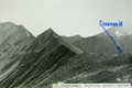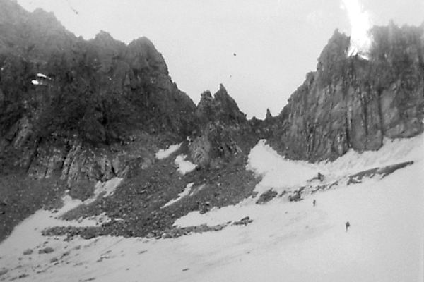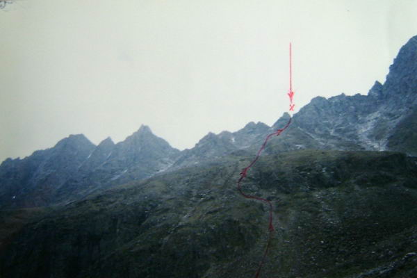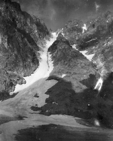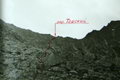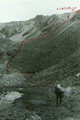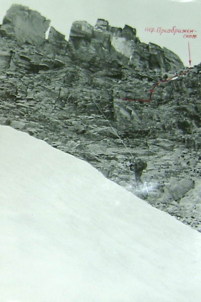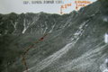 Между двумя вершинами в гребне есть два понижения: чуть левее острой вершины - более высокое и еще левее - ниже. Вот это второе понижение и есть перевал Спартак. Подниматься на перевал можно "в лоб" по кулуару, но это тяжело, т.к. дно кулуара покрыто крутой осыпью. Мы осыпью метров 300 левее перевала поднялись к зеленым наклонным полкам и вошли сразу в среднюю часть кулуара. Здесь связка из 2-х человек прошла на перевал и навесила вертикальные перила 150 метров до самого перевала (фото 43). Ничего опасного, за исключением скользкой стенки высотой в 4 м в средней части кулуара, здесь не было. Но по веревке идти как-то спокойнее, быстрее и безопаснее, поэтому мы ее применяли часто, стирались не рисковать.