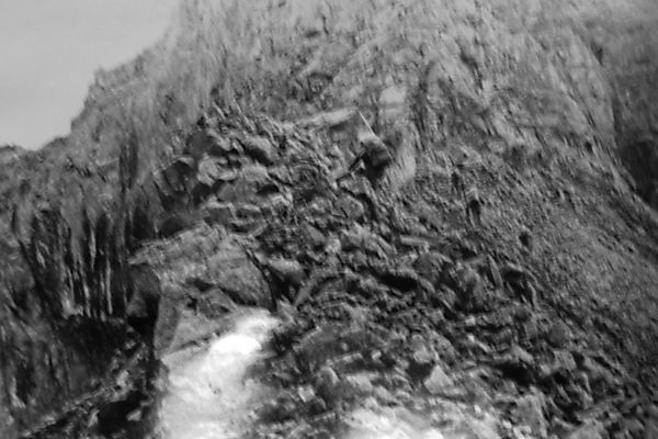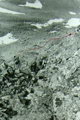 Спуск (фото 46, 47, 48) по скально-осыпным полкам к кулуару, по обе стороны которого крутые ледники. По скально-осыпному кулуару прошли по вертикальным перилам 50 метров до осыпи средней крутизны, по которой спустились 350 м на снежник правее срединной морены. Далее пришлось идти по этой морене в направлении большого озера. От этого озера после ригеля увидели еще одно озеро, слева от которого в хребте сияла огромная брешь - перевал Новосибирцев. Еще на одной террасе, ниже, множество мелких озер и протоков, а сама терраса упирается в огромный ригель (метров 250). Мы прошли по руслу правого истока р. Ягельной ригель (можно по левому, но не посредине), по наклонному водопаду, затем прямо по руслу, т.к. берега сильно заросли, пока не набрели на очень хорошую тропу, которая в основном идет по правому берегу, хотя в верховьях иногда переходила на левый, иногда теряется в болотах.