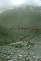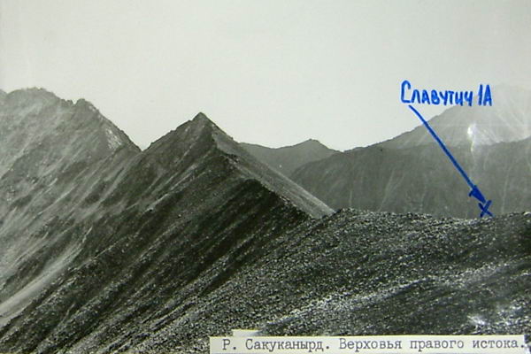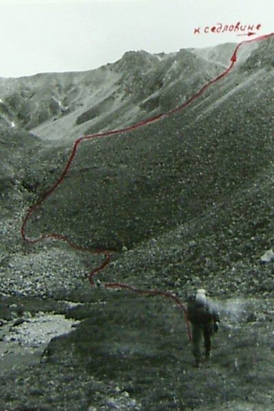 Из долины реки поднялись по осыпи на ригель "кармана" и далее по осыпи м 300 к началу кулуару. Кулуар вначале широкий, со средней осыпью, тянется вверх к перевалу м 150, переходя в верхней части в кулуар-полку м 100 с мелкой осыпью, по которой траверсом влево можно выйти на перевал. Чтобы легче было подниматься, навесили обе веревки и вышли на гребень, где спокойно можно перемещаться и собраться всей группой. По хребту прошли к левому понижению. Туров не нашли. Левое понижение более доступное, т.к. осыпь в кулуаре средняя и хорошо держится. Сложили тур, оставили записку и спустились по средней осыпи средней крутизны м 400 в верховья реки Сакуканырд, но теперь в ее правые истоки (фото 72). Перевал назвали Корень Ложный (1Б).