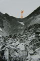 С седловины поднимаемся наверх в северо-западном направлении к менее заметному понижению в гребне (точка Б фото 25). Здесь стоит небольшой тур, но записки в нам не нашли. Оставляем в туре свою записку и начинаем спуск с перевала.