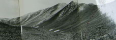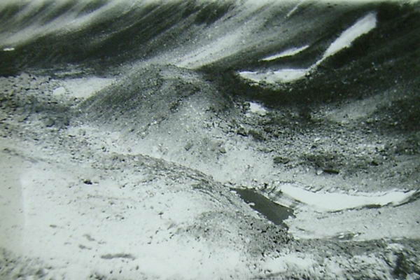Н=1900м. Площадка причудливо разрисована руслом образующегося ручья (фото 33). Пересекаем ее за 20 мин. Еще полчаса спускаемся по крупным камням (до 2-3 м в диаметре) к реке Изогман.