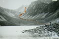 Сделав разведку всей седловины, принимаем решение спускаться в самой левой (по ходу) части. Организовываем страховку, вешаем веревочные перила и первый участник с рюкзаком уходит вниз (фото 78). Через 10 м отвесная 25-ти метровая стена (фото 79), затем выход на кусочек ледового снежничка длиной 10-15 м и на крутую осыпь. Спуск дюльфером со страховкой. Хорошо подготовленные технически и физически туристы могут спуститься спортивным способом. Лучше спускаться с рюкзаком, т.к. отдельный их спуск отнимает много времени, и они могут застревать в расщелинах. Можно спускаться по центральному кулуару, но спуск будет намного дольше и сложнее. Предыдущая группа спускалась именно здесь, об этом говорит петля на большом неподвижном камне-пальце. Но при спуске возможность камнепадов здесь намного выше и больше, чем при выбранном нами. Продергиваем веревку, оставляя один крюк в "память Кодару". 50-60-ти метровой веревки вполне достаточно для спуска. Далее по осыпи уходим серпантином в цирк, пересекаем большой снежник и спускаемся к озеру. Оно расположено как бы посередине в ямке и окружено кругом навалом камней-валунов, покрытых мхом и очень скользких. Проходим моренный вал с хаосом камней и выходим на ровные площадки. Мох, ягель. Есть кустарник ивняка. Отсюда пройденный перевал смотрится довольно внушительно (фото 80).