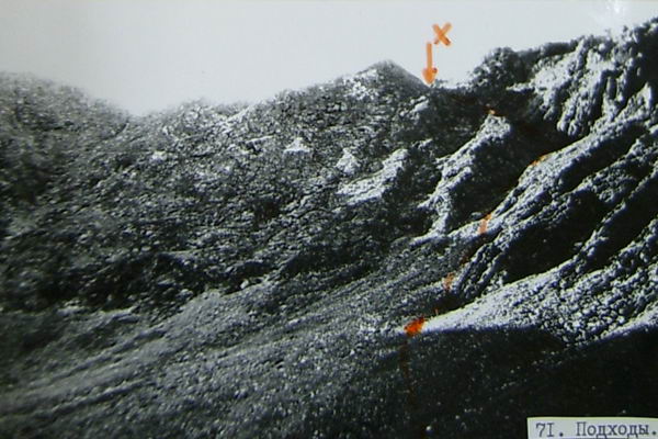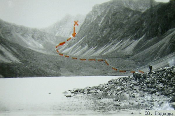 Возможны два пути подхода к перевалу Челябинцев. 1-й - вдоль ручья, круто спадающего с ригеля северного, цирка, 2-й - в обход - через значительное понижение (точка А на фото 26) в отроге. Им выбираем первый вариант. От места ночевки к началу подъема подходим за 20 минут.