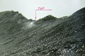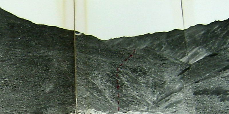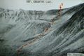 Подъем по подвижной осыпи, скалолазание. Крутизна местами достигает 40-45° (фото 52). Самостраховка ледорубом. Строго соблюдаем дистанцию. Много живых камней.