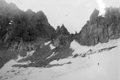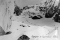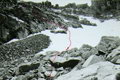 Спуск с перевала начинаем западнее тура по крутым (местами до 45-50°) сильно разрушенным скалам. Самостраховка ледорубом, а где это возможно, придерживаемся за выступы скал. Выбираем полочки. Наиболее крутая часть спуска производится по слабо выраженному желобку, придерживаясь за выступы скал справа и соблюдая минимальную дистанцию между участниками, поскольку здесь направление движения - прямо вниз. Спускаемся, разумеется, в касках. Далее крутизна скал немного уменьшается и, спустившись еще немного выходим, на снежный склон крутизной около 30-35°, которым далее выполаживается. Снег средней плотности глубиной до 30 см. Спускаемся по нему на ледник. Трещин нет (фото 54, 55).