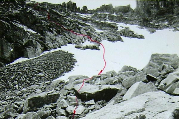 ледовый кулуар почти постоянной крутизны (45°) высотой около 500 м (750 м