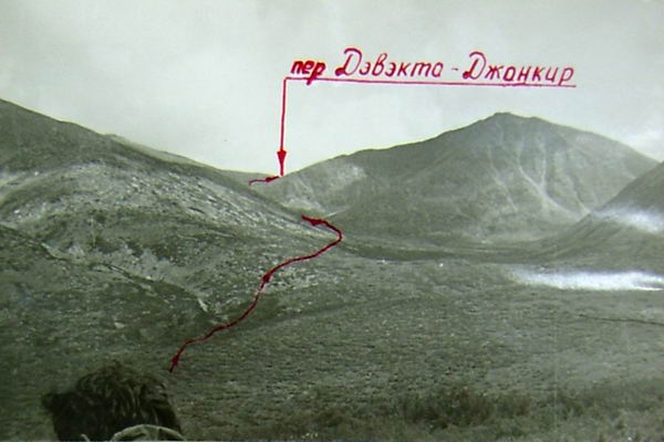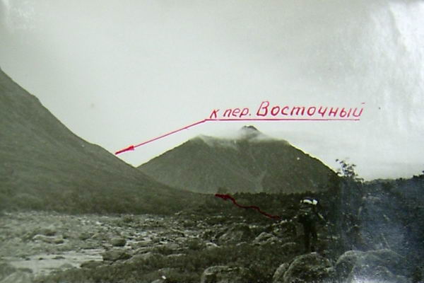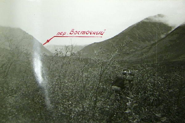 Утром переходим по камням приток р. Дэвэкта и поднимаемся к границе стланиковых зарослей. Через 0,5 часа подходим к очередной развилке ручьев. Продолжаем движение вдоль юго-восточного истока. Не спускаясь на дно долины, траверсируем по курумнику к основанию вершины 1184 м. Прямо на восток в гребне между вершинами 1184 и 1835 ближе к вершине 1184 м видна четкая седловина перевала. Через 1 час после развилки подходим к последнему взлету на перевал - крутой подвижной осыпи (35°). Через 20 мин. мы на перевале. Называем перевал "Восточный", ориентировочная категория сложности 1А.