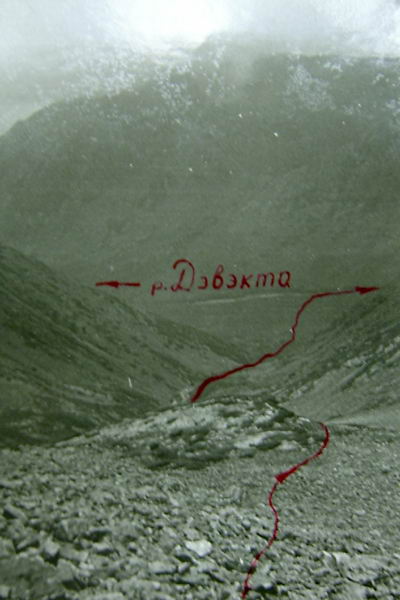 Быстренько сложив тур в западной части плато и оставив в нем записку, начинаем спуск к р. Дэвэкта, русло которой хорошо видно с перевала. По узким травянистым полочкам спускаемся к пологой осыпи (15°) и по ней, обогнув бугор и придерживаясь правого борта долины (фото 56) за 40 мин. спускаемся к границе густых стланиковых зарослей. Первые же отдельные кусты стланика стали попадаться сразу за перевалом. Еще 1 час спуска по зарослям и мы в долине р. Дэвэкта.