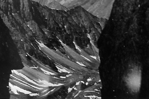Еще с перевала Панова в левом цирке верховий Апсата мы увидели низкую перемычку в сторону долины ручья Изогман и решили попробовать пройти ее. По осыпи подошли к перевальному взлету (фото 59, 60), минуя озеро, не указанное на карте. По осыпи средней крутизны вышли на широкую длинную перемычку (фото 61), с которой не так-то легко спуститься в долину Изогмана. Можно спуститься влево к скально-осыпному кулуару и далее по веревке метров 80 выйти к осыпям, выводящим на снежник. Но есть здесь более легкий спуск: в правой части перемычки у самой вершины, вблизи от гребня в долину Изогмана шел грандиозный осыпной кулуар с мелкой и средней осыпью. По этому кулуару вплотную друг к другу мы и спустились метров 200 (фото 62).