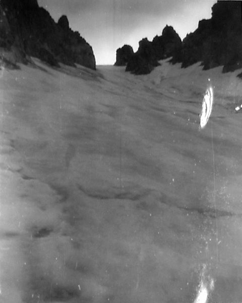 Спуск с перевала крутой, по заснеженному кулуару. В кулуаре наст и, хотя он узок, но, накатываясь на его борта, получается отличное катание. Потеря высоты около 300 метров.