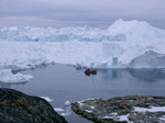 Погрузив на плоскодонную лодку горнолыжное оборудование, команда направилась к айсбергу. Молитвами к покровителю путешественников святому Николаю Чудотворцу, которые возносили в те дни родственники членов экспедиции, погода была не просто хорошей, она была идеальной для такого авантюрного действа: солнечный день без единого облачка, штиль, и относительно тепло (+5 градусов). Должен отметить, что за все время пребывания в Гренландии такая погода была всего два дня - в другие дни были сильнейшая метель, ветер, холод, низкая облачность - что в наших краях соответствовало середине марта.