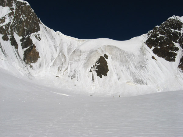 Долго рассматриваем путь дальнейшего подъёма. Самый простой - по снежному склону напрямую на перевал. Но склон лавиноопасный, у его подножия есть след от сошедшей снежной доски. Сверху серия широких трещин. Поэтому решаем идти на перевал гребневым маршрутом, в связках по крутому леднику, присыпанному снегом. Поднимаюсь первым, крутизна склона возрастает. 100 м верёвки - и мы на гребне у скальных жандармов (высота по датчику GPS 4200 м). С Дмитрием Мансуровым организуем следующие 100 м вертикальных "перил" - задел на следующий день. С утра их "жумарим". В связках проходим ряд скрытых трещин и выползаем на огромное плато. По нему выходим на седловину перевала.