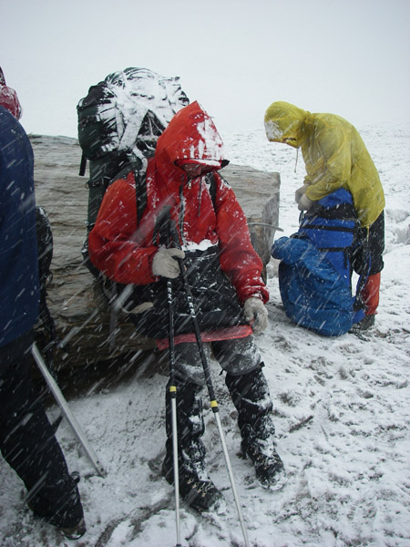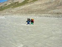 На следующий день начинаем спуск: сначала 100 м до бергшрунда, потом 150 м по заснеженному леднику крутизною от 45 до 60°. Видимость метров 50. Град сменяется снегом, и это безобразие длится до вечера. Спуск продолжается, глубина снежного покрова полметра. Ледопад Каинды неожиданно удалось пройти в связках. Переходим реку Каинды. По её левому берегу обходим прижимы. Вот и первая зелень: низкая трава, редкие кусты, невысокие колючки, которые напоминают облепиховые заросли, и даже есть медвежьи следы на песке.