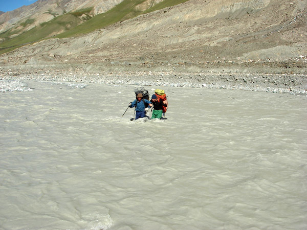 20 августа. Ранним утром, когда поток мелеет, организуем переправу. Ширина реки 30 м и глубина 0,8-0,9 м. Главная проблема - скорость потока более 2 м/с. Страхуем Равиля Шафигуллина, он идёт первым, упираясь альпенштоком. Затем натягиваем "перила", по которым остальные переправляются на левый берег.