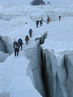 Теперь предстоит несколько дней топать по леднику до следующего перевала. Вечером идём под проливным дождём. На следующий день в обед встречаем группу англичан, её ведут казахские инструкторы. От них узнаём, что знаменитое озеро Мерцбахера, расположенное в месте слияния ледников Северный и Южный Иныльчек, в этом году "выливалось" дважды. Это очень интересное природное явление. Вода изливается из озера по подлёдным каналам ледника и огромной волной катится по долине реки Иныльчек (уровень воды в ней сразу же поднимается на несколько метров). Когда произойдёт прорыв, предугадать сложно.